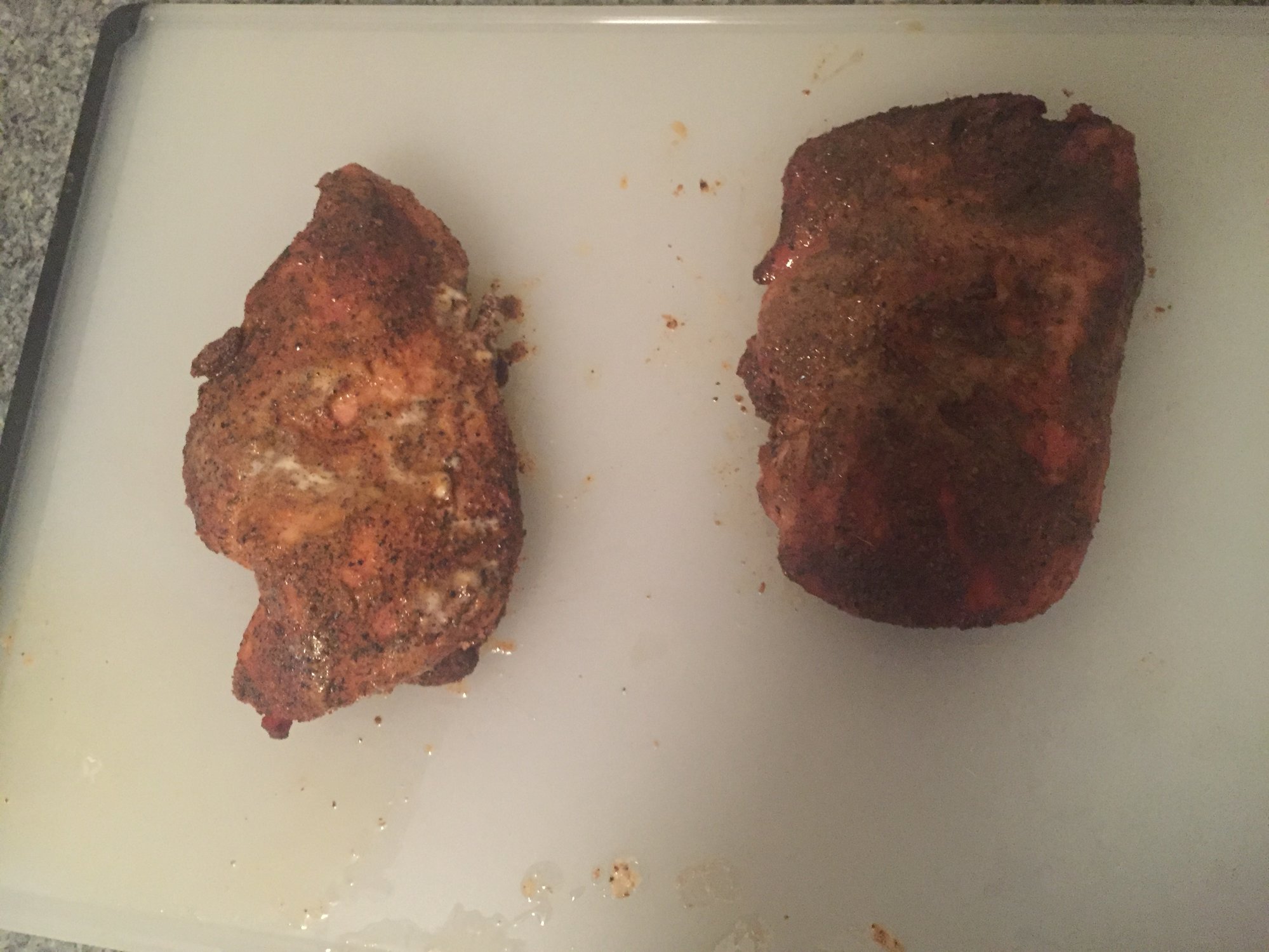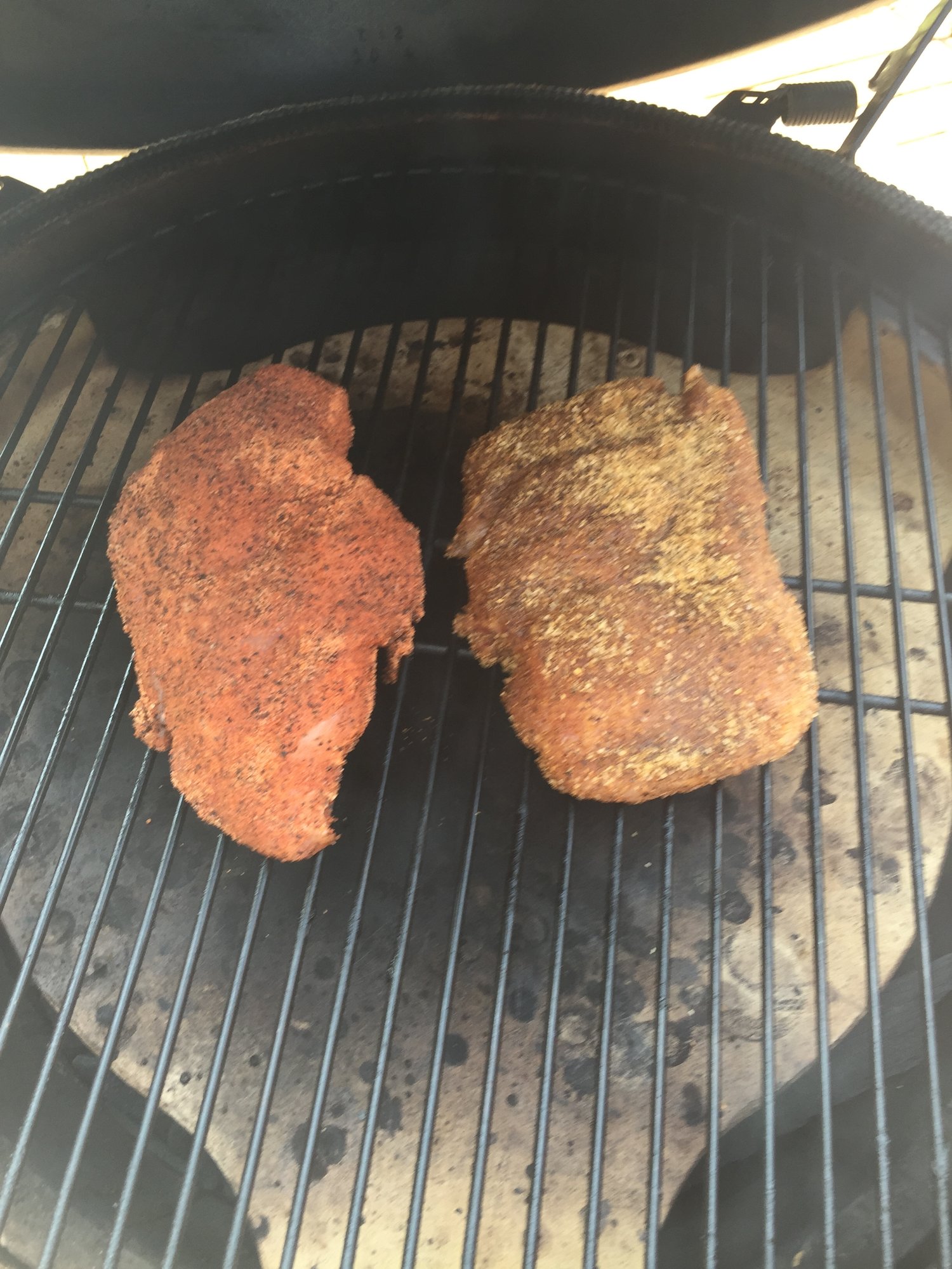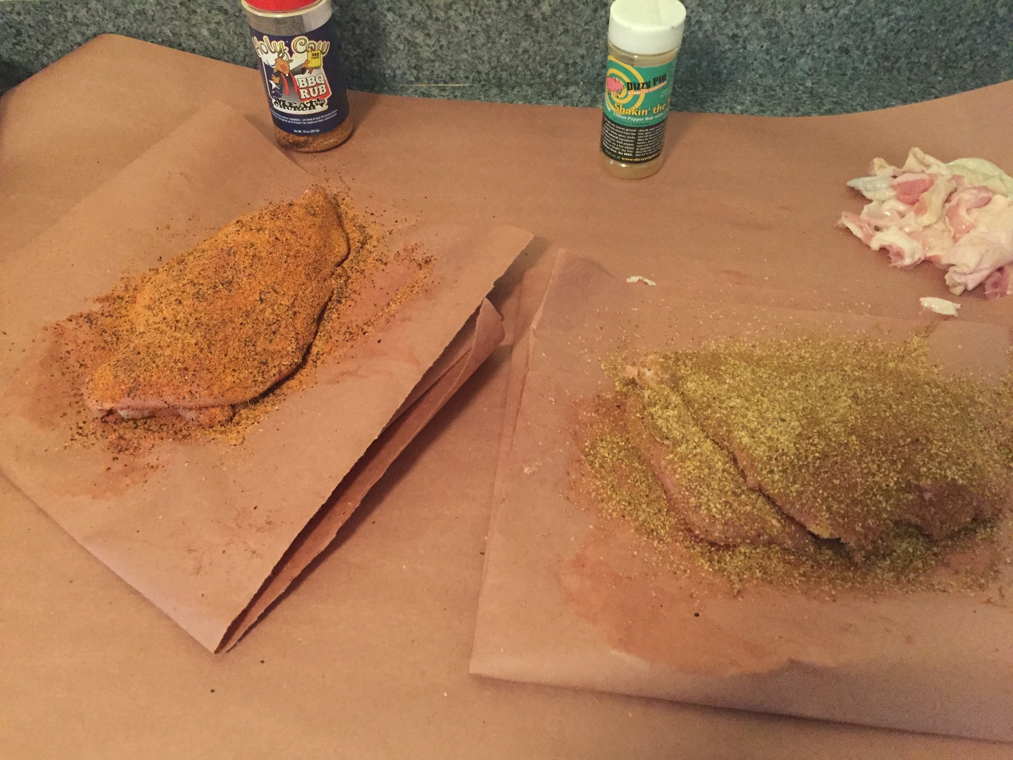 Use your favorite rub liberally. And put on the smoker skin side up at ~265F. In this case I used MCs Holy Cow and DPs Shaking the Tree