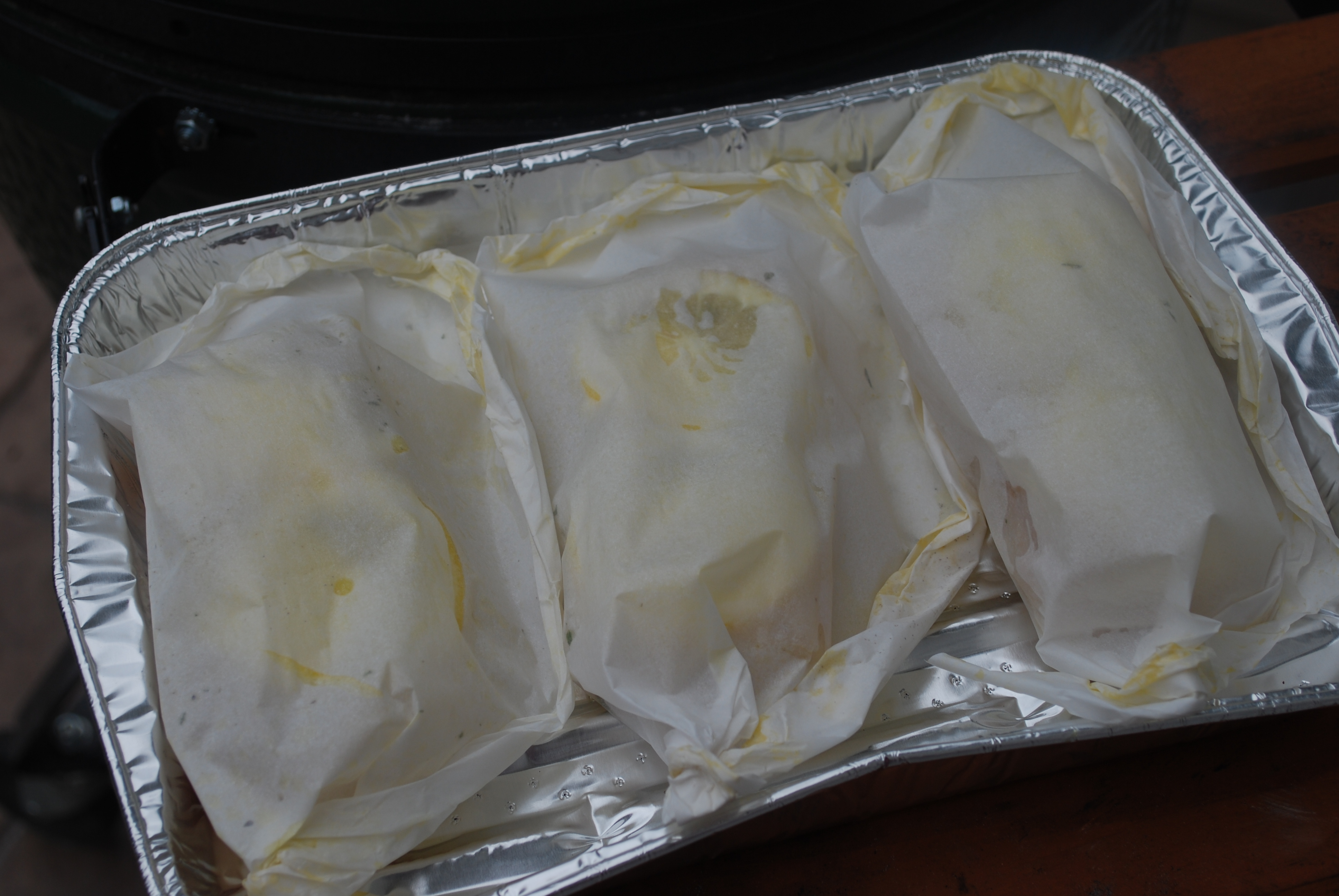 Wanted to prove to the wife that not everything on the Egg had to come from a pig, a cow, be wrapped in bacon, or have a smoke ring, and that I could cook something healthy.  Halibut filets cooked in parchment (en Papillote as Julia would say).  Turned out very moist, tender and flaky.  Did them indirect at 400 for 20 minutes.  In order to not be too healthy and ruin my reputation, threw on a batch of oatmeal raisin and chocolate chip cookies after the fish.
