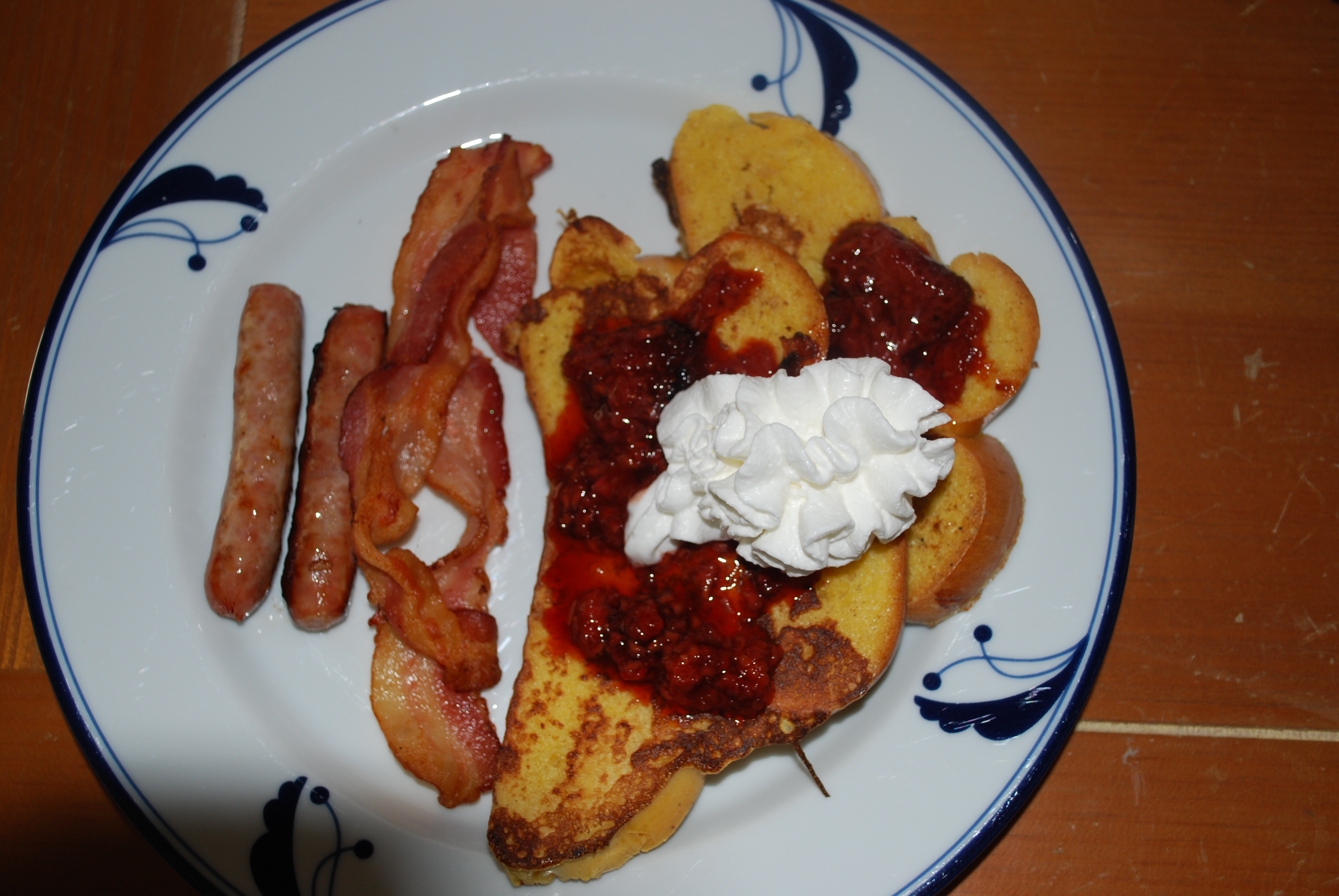 To celebrate our independence, as well as my independence from the gas grill, decided to cook everything on the Egg today, starting with breakfast.  Cinnamon French Toast Challah bread, with roasted Grand Marnier berry compote, sausage and bacon.  Lunch will be hot dogs, the July 4th tradition, then a flat iron steak, grilled potato slices and roasted corn on the cob.