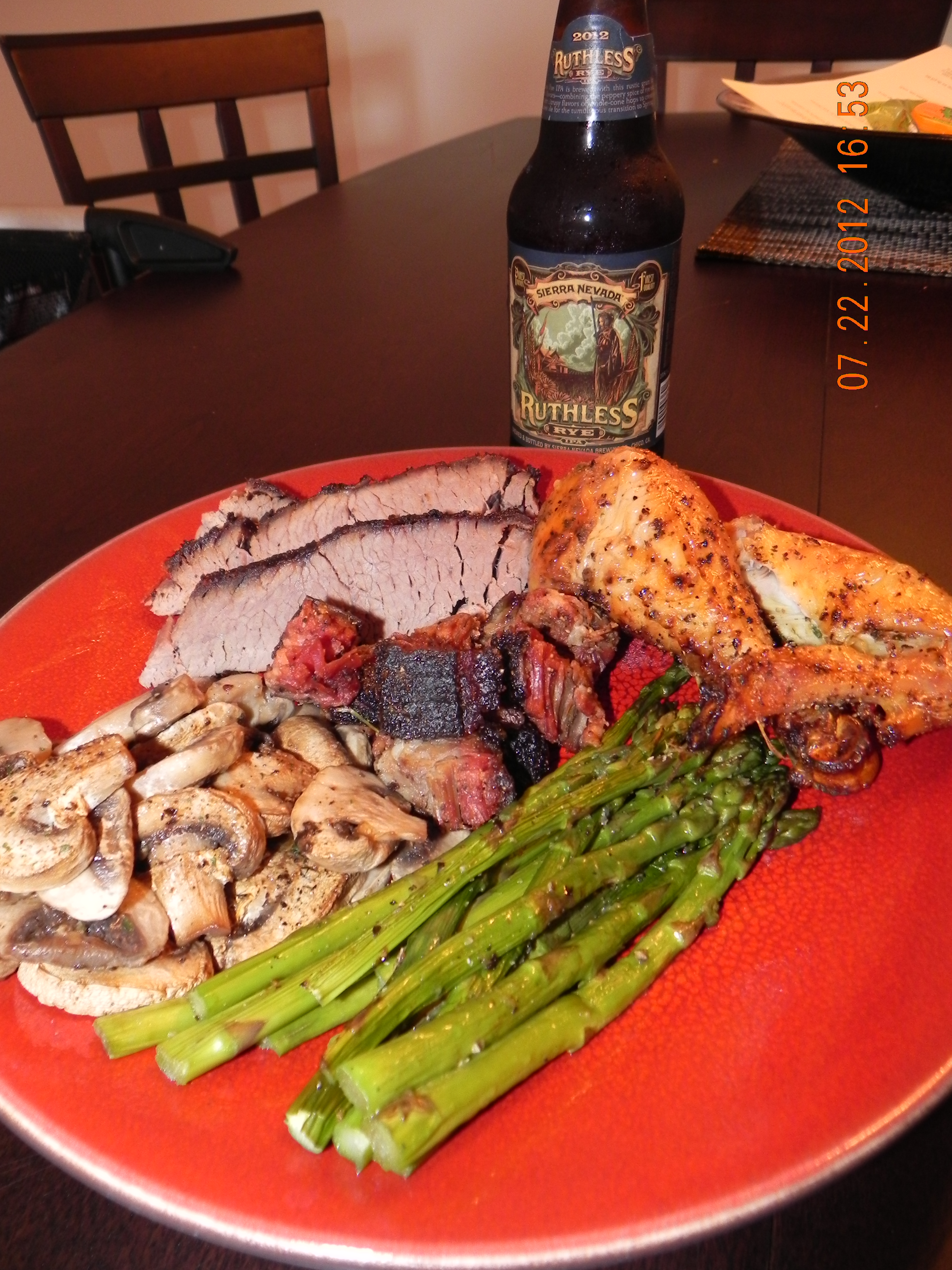 Okay everyone, wanted to post one last picture. This is the final end product that we're just about to sit down and enjoy. The flat is a little overdone, probably due to high cook temps last night, but it's all pretty tasty. Gotta love that all of this came from the Egg, and really from a single cook. Hope everyone else enjoys as much as we will.