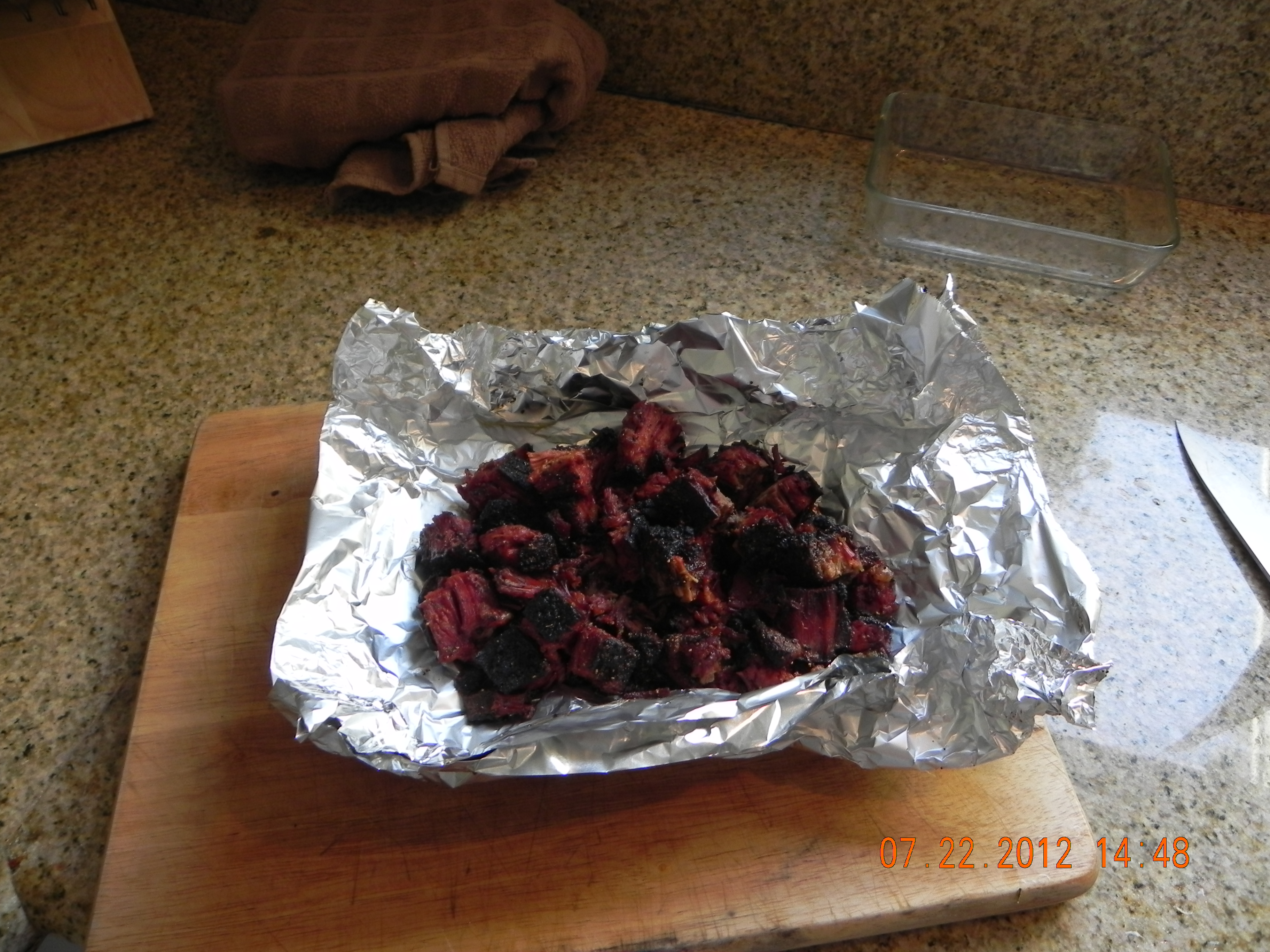 Well.....certainly not thee best I've ever made but it was pretty good. A little light on smoke and rub. Last time I thought I used too much run and that it was too salty. I backed off and probably too much. It was well cooked though and it was certainly better than the sammich I had at the BBQ trailer by my house Friday. Not evn. Lose on that one.