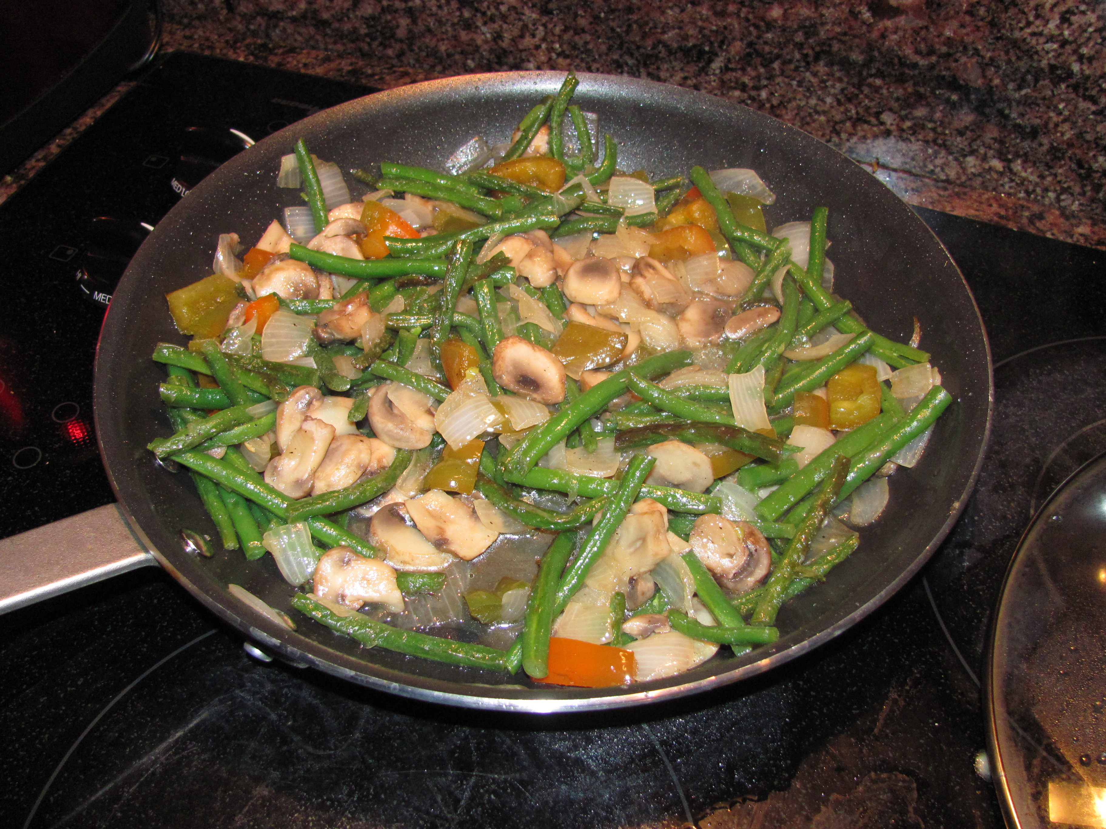 The endless quest for variety under constraint. Turkey sausage marinated in Dichickos Garlic. Inside green beans, onion, pepper, and mushrooms sauteed in EVOO with garlic, sea salt, and pepper, .