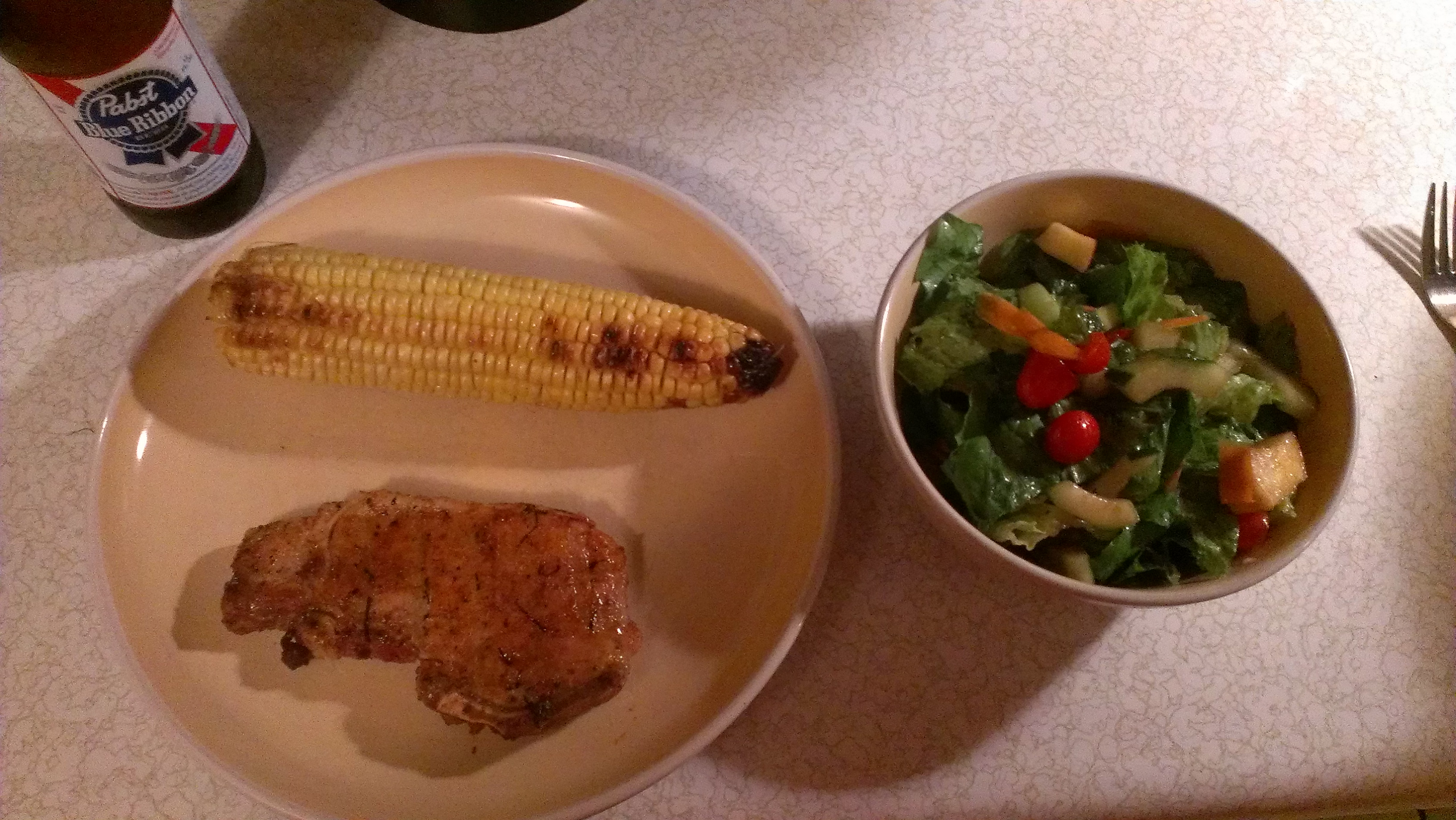 On Fridays the town that I live in (Lilburn,Ga.) holds a farmers market, and a couple of weeks back I stumbled upon a great seasoning and I just wanted to share. It's called Seasonest Seasoning Blend "Original", and boy is it tasty. I have added this to everything from pork chops, fish, veggies, etc. and I have not found one thing that it does not taste good on. This blend is a family recipe that is being carried on and sold by two women whose grandfather had originally come up with the recipe. I am not sure whether or not they have a website, but this Friday I will stop by and ask so that any of you who may be interested can purchase. If any of you stumble across this blend at a local Ga. farmers market I heavily suggest picking some up! Last nights pork chop dinner was seasoned with their rub and of course turned out to be another hit off of the egg! Our meal consisted of bone in pork chops with roasted corn and a tomato, cucumber, carrot, and apple salad with a balsamic country dressing along with a nice cold beverage. Here are the photos!
