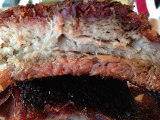 • Here's how they turned out four hours later. A full quarter inch of crisp-bacon-like 'bark' on top, decent but little tender meat inside, and bottom overcooked bark. To say well done would be an understatement. You've got to have a good set of molars to crush these babies. Crunchy through and through, will need a bottle of BBQ sauce for each rib rack. Definitely tasty but certainly 'destroyed' by 'fall off the bone' standards. Yeesh. Including my failures here just like I would a 'success'. I've been able to duplicate just about everything on the BGE forum that I read about but ribs. For some reason I consistently disappoint in that category. Next.