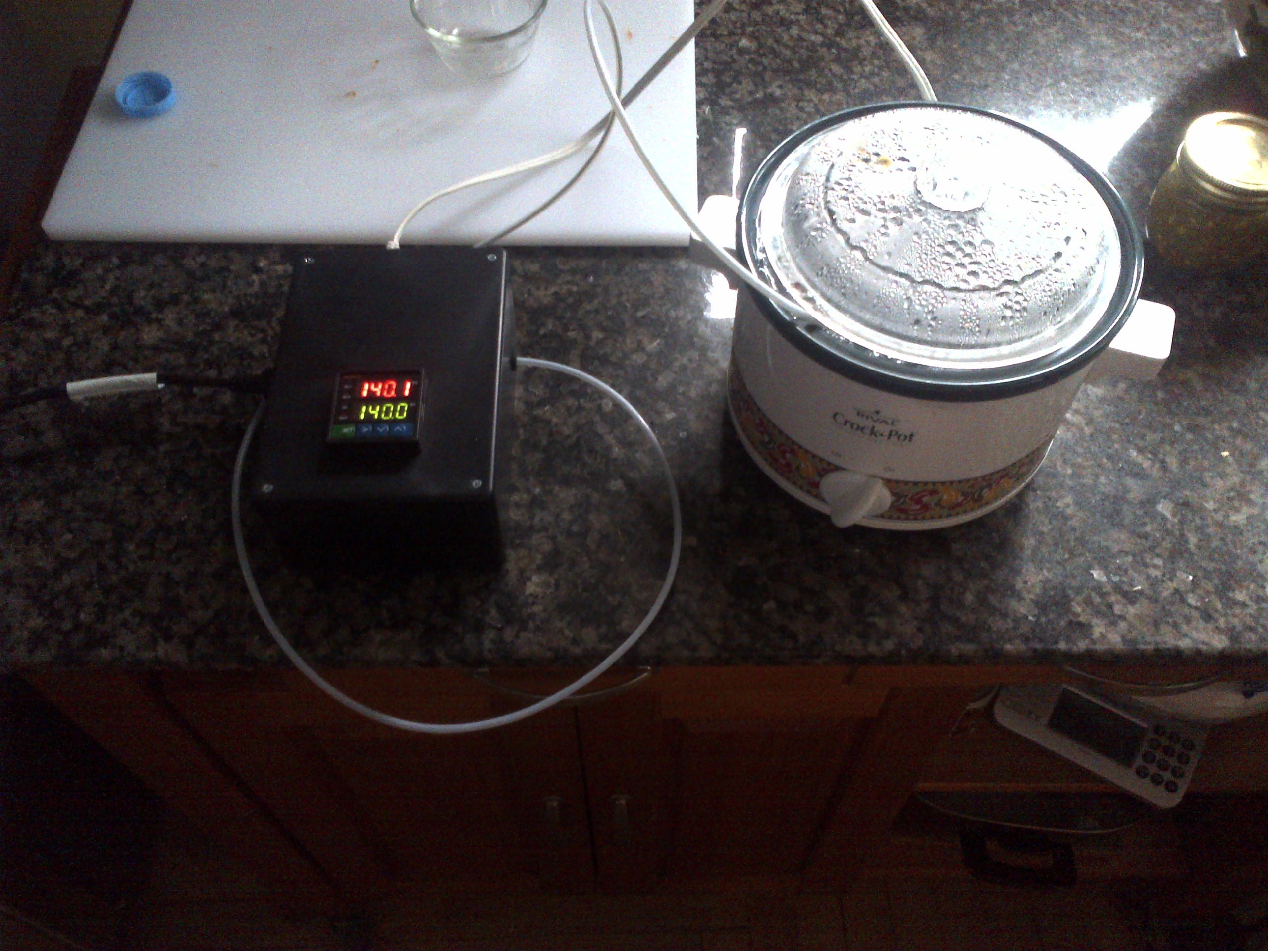 I have been running a test of my new sous vide controller today. So far, so good, right now it is only working with a small crock pot filled with water, but it has been holding at 140 for about 5 hours.