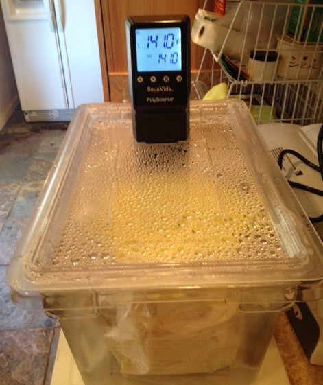 Got the sous vide going this morning with the pork loin cut into thirds. Put hot water from the tap in the container and set the temp. at 141. The tap water showed 146, but cooled down to 141 within 10 minutes. After I put the meat in the temp. dropped 3-1/2 degrees for about 5 minutes and then back to 141. As Nola said the Polyscience Profess. is a beast. I choose 141 to make sure the centers would reach 130 + within 6 to 7 hours. After they finish in the sous vide, I'll be taking them over to my mother-in-laws to finish searing on her gasser about a 1/2 hour wait between taking them out and searing.
