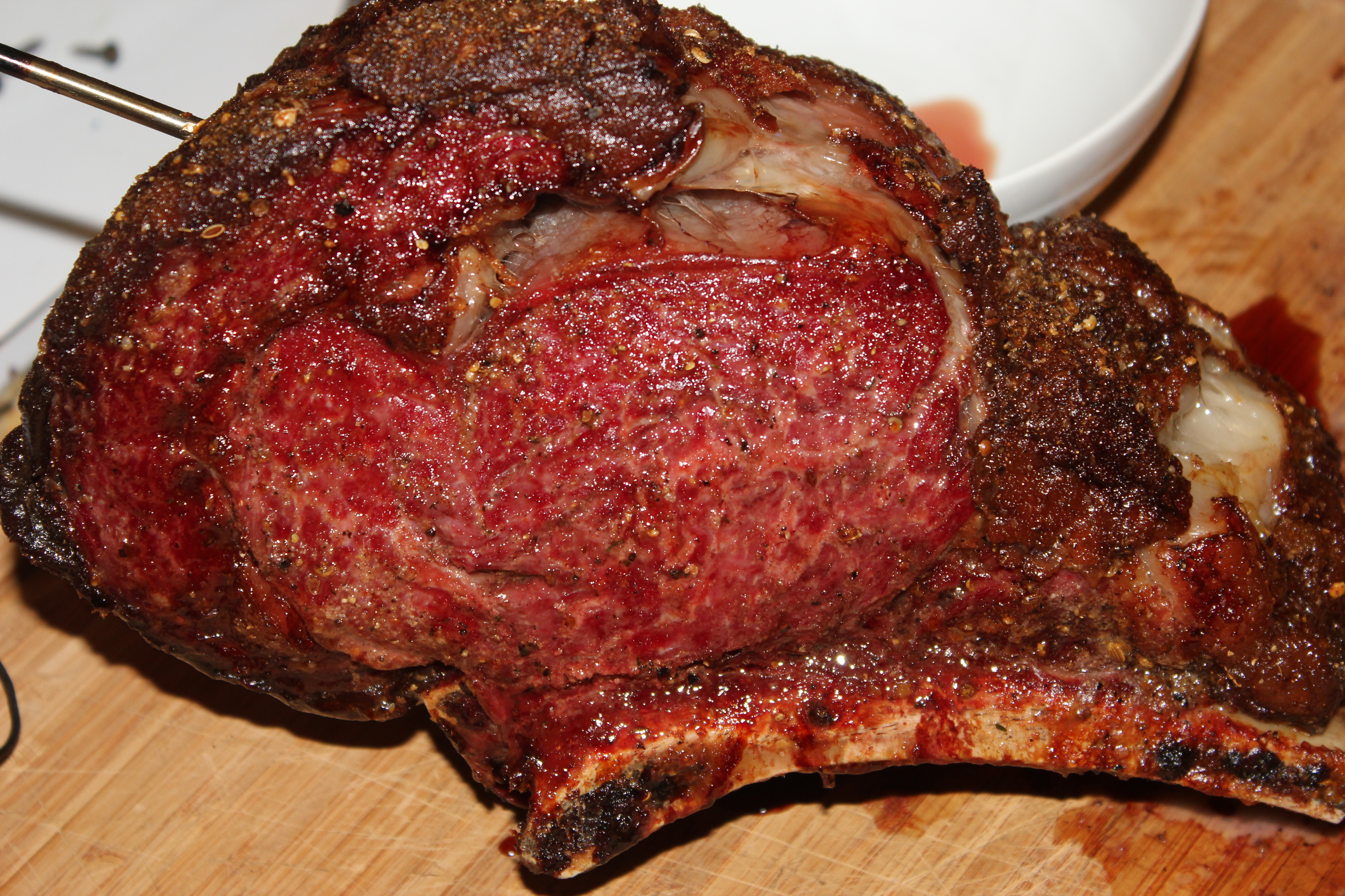 ok....the 4 week wait is finally over. Slow cooked (275* with no wood for smoke, NO SEAR)...drippings used for mini Yorkshire Puddings. 1st shot is 14 day, then 21... Photobucket Pictures, Images and Photos Photobucket Pictures, Images and Photos finally....28 days. Photobucket Pictures, Images and Photos Photobucket Pictures, Images and Photos Photobucket Pictures, Images and Photos all trimmed up. Photobucket Pictures, Images and Photos removed from the bones and retied back up for easier slicing and rubbed down with a paste of EVOO, kosher salt, black pepper, garlic, onion powder. Photobucket Pictures, Images and Photos Photobucket Pictures, Images and Photos after Egg, rest, and sliced Photobucket Pictures, Images and Photos Photobucket Pictures, Images and Photos served up with mini Yorkshire pudding, creamy polenta, and sautéed green beans. Photobucket Pictures, Images and Photos Photobucket Pictures, Images and Photos best beef ever. the aging process is so worth it. much more concentrated beef flavor. started with 9 lb roast and after drying and trimming, ended up with 7 lb 3oz. Merry Christmas Everyone!!!
