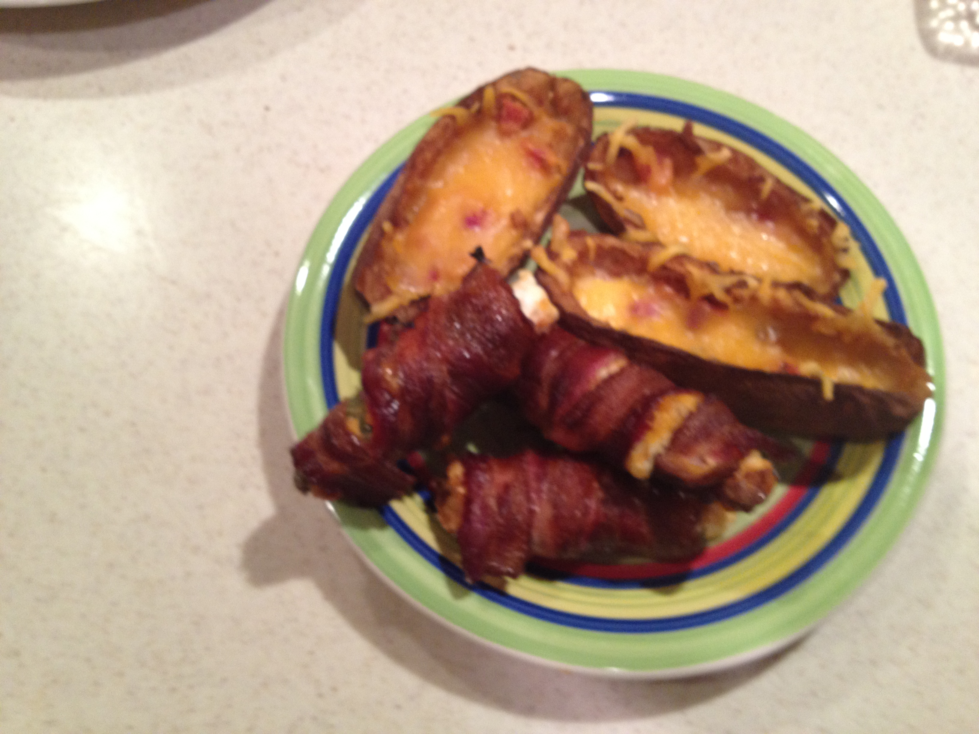 We kept it simple this year, doing some ABTs, Potato Skins, some Totino's Pizza Rolls (guilty pleasure), and some tamales procured from Luna Tortilla here in Dallas. I wanted to change up the potato skins a little bit and add some smoke to them. I do my ABTs indirect with some hickory at 250 for about 2 hours, so I put the skins on (after SWMBO had done the baking and scooping) the Woo extender above the ABTs for about 90 minutes. I pulled them (they were nice and crispy) filled them with cheese and bacon, and then put them back on for about 10 min or so to melt the cheese.