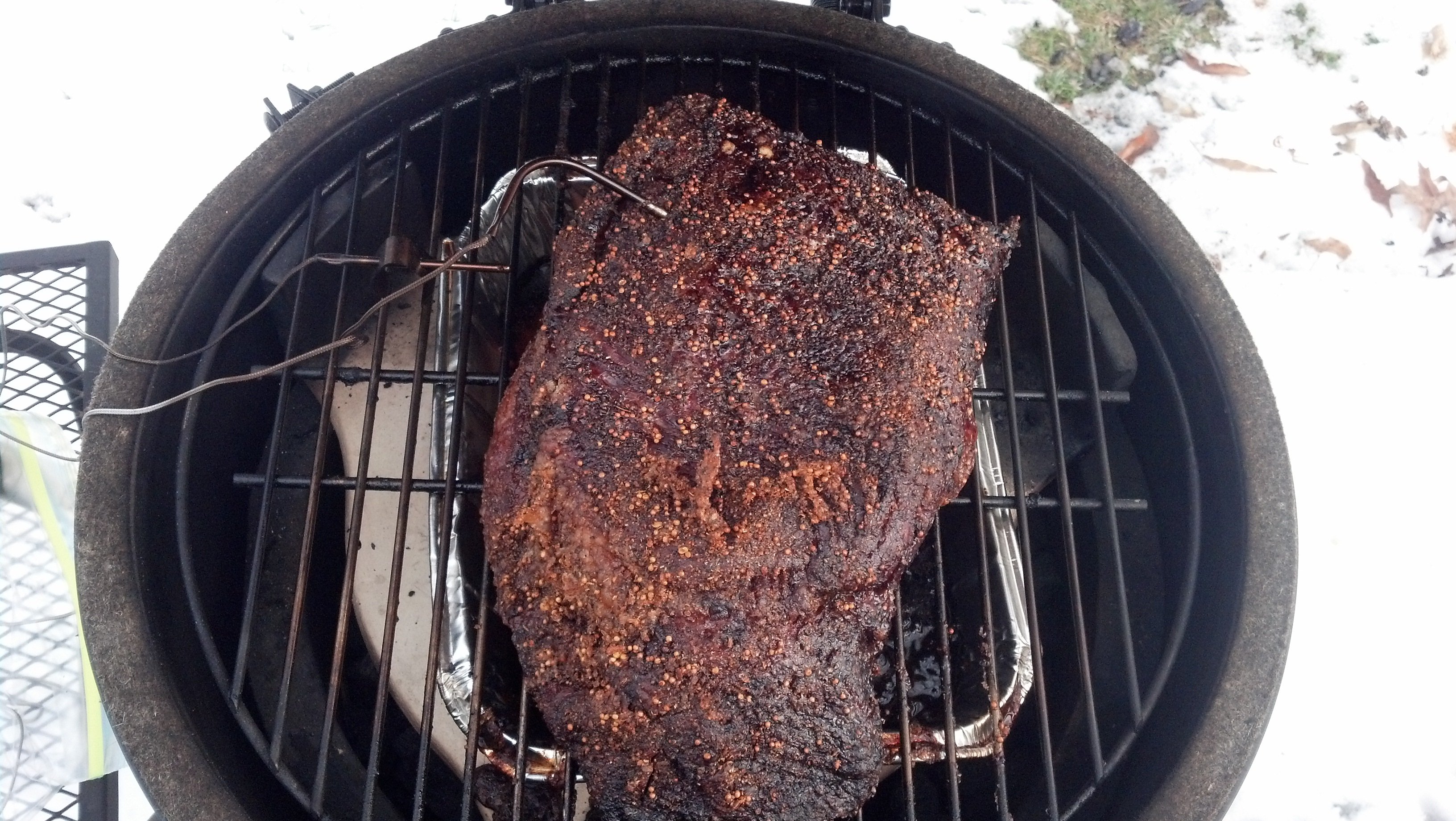 Still moving along. About 13 hours and the flat is not quite up to temp yet and probing was difficult. Currently at 180 with a grid temp of 240 which was bumped up from 230. It is climbing slowly, shooting for 265 for the final push.I think if I'd had stayed at 265 I'd have been done by now, but since not serving till 4, still got plenty of time.