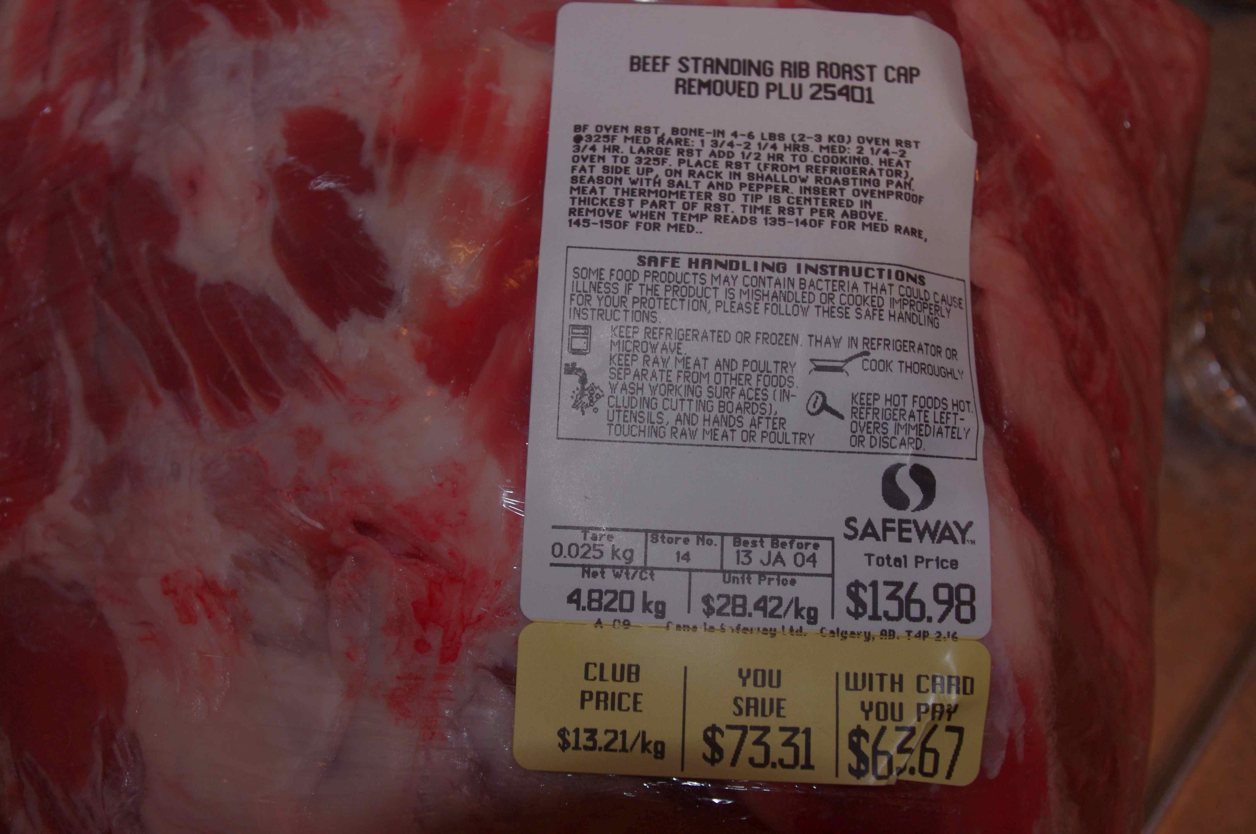 Maybe I have more time than some, but I watch the sales. Other than brisket, everything comes on sale maybe two or three time a year, stock up.Recently, Safeway had standing rib, bone in, AAA (Choice for Americans I think) for $5.99 per pound with a limit of 4. (this one is 4.820 Kg, or about 10.6 pounds)The packaged roasts were typically four pounders, I asked the butcher for a four or five rib roast, take the bones off, tie back on for me. Picked up two more before SWMBO said "that's enough, the freezer is full".Delta B.C. - Whiskey and steak, because no good story ever started with someone having a salad!