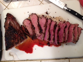 Looks great. I can see the super-fast thermapen definitely prevented you from overcooking those tri's!Which came first the chicken or the egg? I egged the chicken and then I ate his leg.