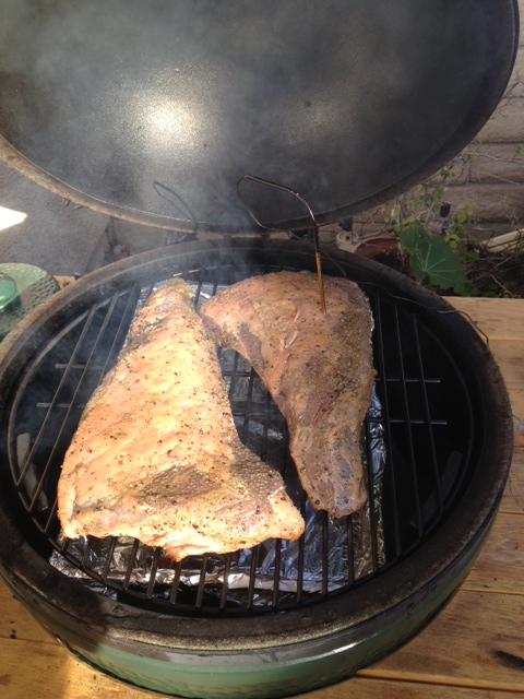 This cook was a great workout for my new Thermapen. Tri Tips (choice) were on sale at Ralph's so I got a couple. Cooked in the Santa Maria style. For the rub I used kosher salt, pepper, onion and garlic powder, oregano, and thyme. As my prime rib on Christmas came out great with the reverse sear method I used it for the second time on these. Cooked at about 275 degrees indirect with oak chips for smoke. When the first one hit 119 degrees internal I pulled it. The second one took a bit longer and I pulled it about 10 minutes later at 115 degrees internal. I let them rest for about twenty minutes, removed the plate setter, opened the vents, and prepared for the sear. I only seared for about five minutes total but it got the job done. During the sear the dome temp jumped to over 700. As I've been taught well on this site, I carefully burped and tried to open slowly before removing the roast. Probably not slowly enough as I still got a pretty good fireball. Pretty exciting. At any rate I let rest a bit longer. The first roast was 128 degrees internal when I carved. It came out really good. Medium rare except at the very edges. The other one was a bit rarer as expected but also great. These pics should help tell the story.