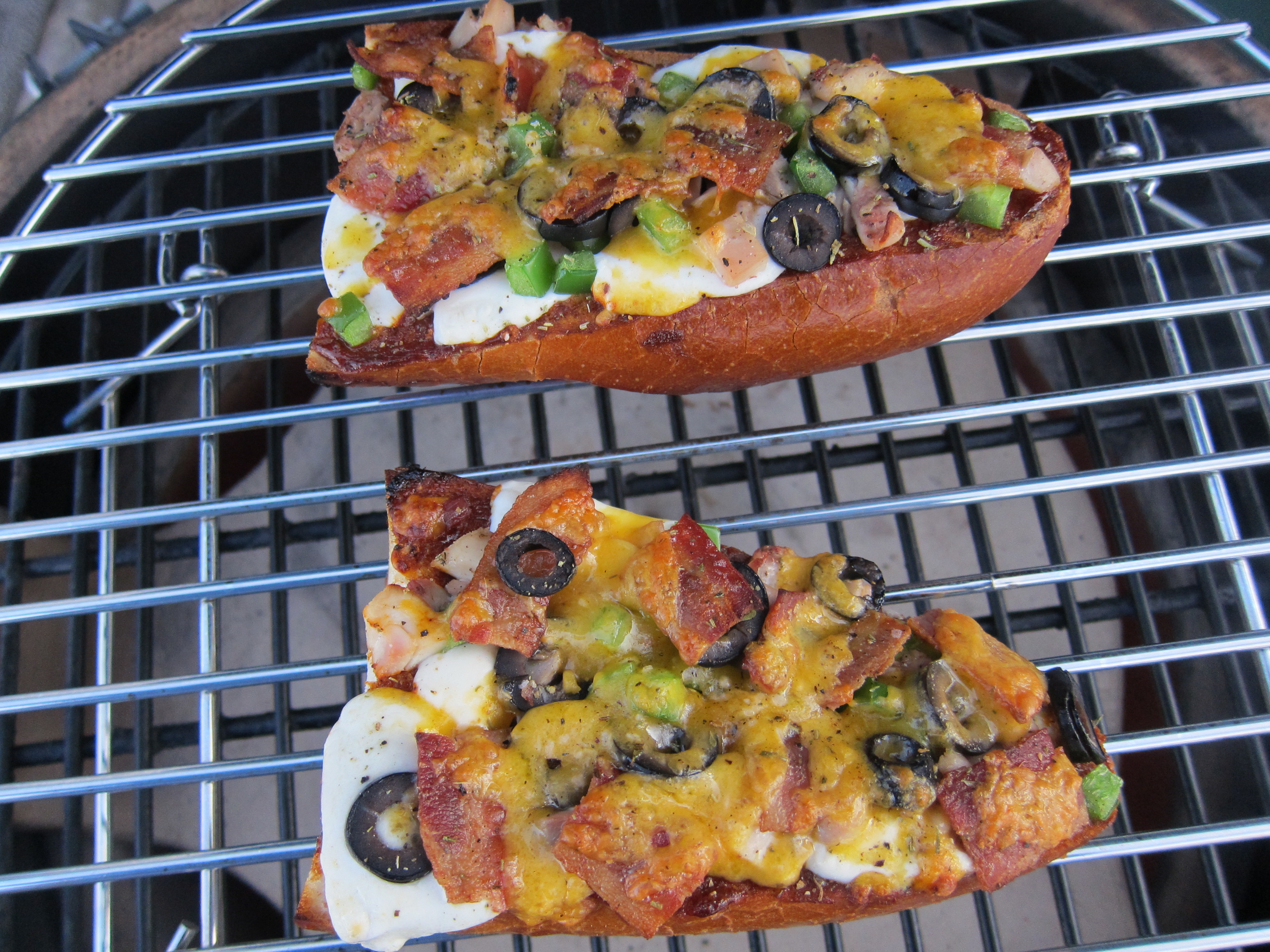Egg at 550 indirect with platesetter, standard grid, and BGE extender. Dug out alot of the dough to make boats. Whipped up a quick sauce in the blender with fire roasted tomato, roasted garlic, saute'd onions, sugar, salt, pepper, oregano. Topped with whole mozz, smoked chedda, and pepperoni. Used APL's BBQ sauce, whole mozz, smoked chedda, leftover diced thigh, grn pepp, blk olive, and bacon on the other. Cooked for about 7-8 minutes. Getting them up higher in the dome is the key.