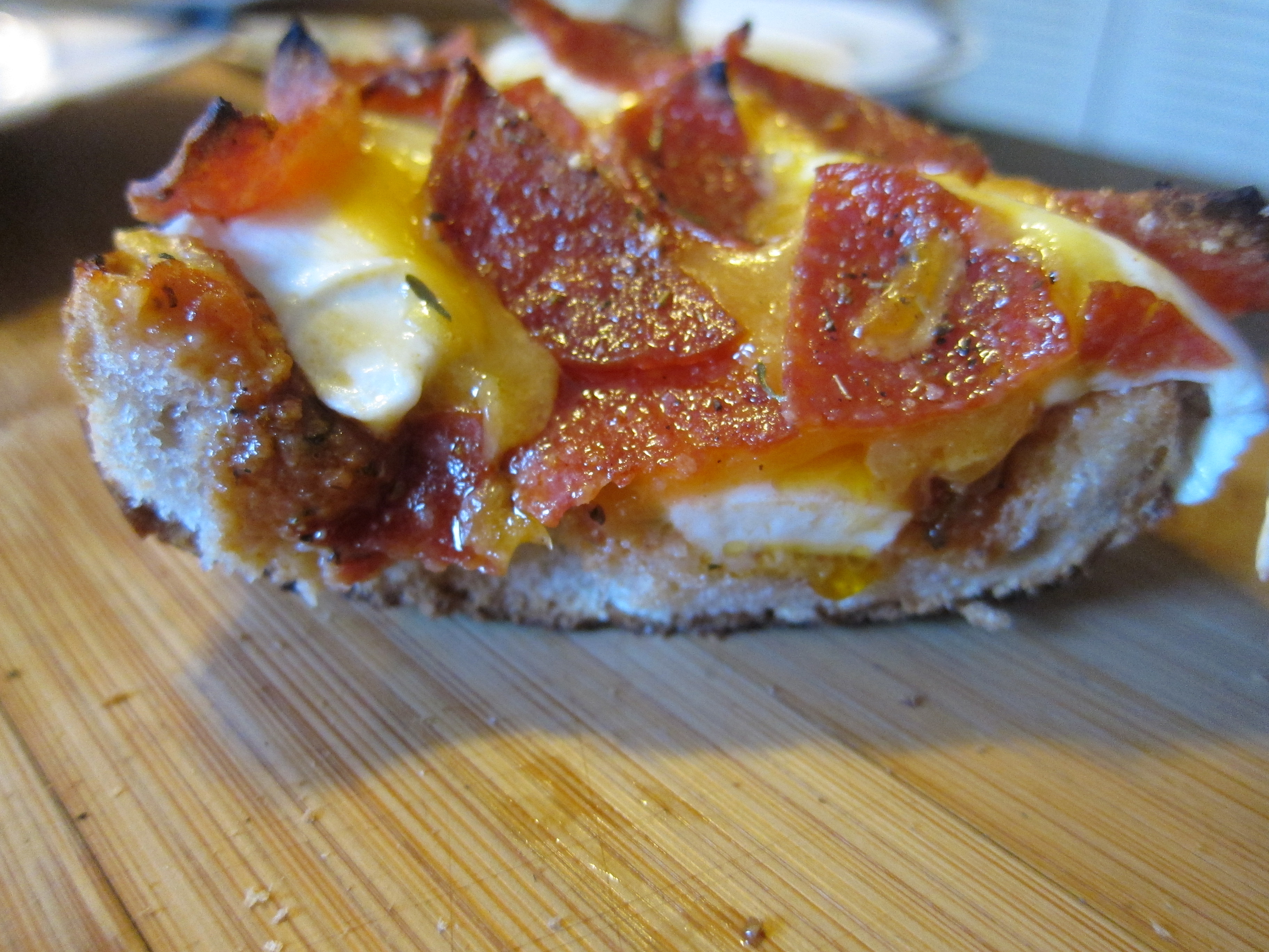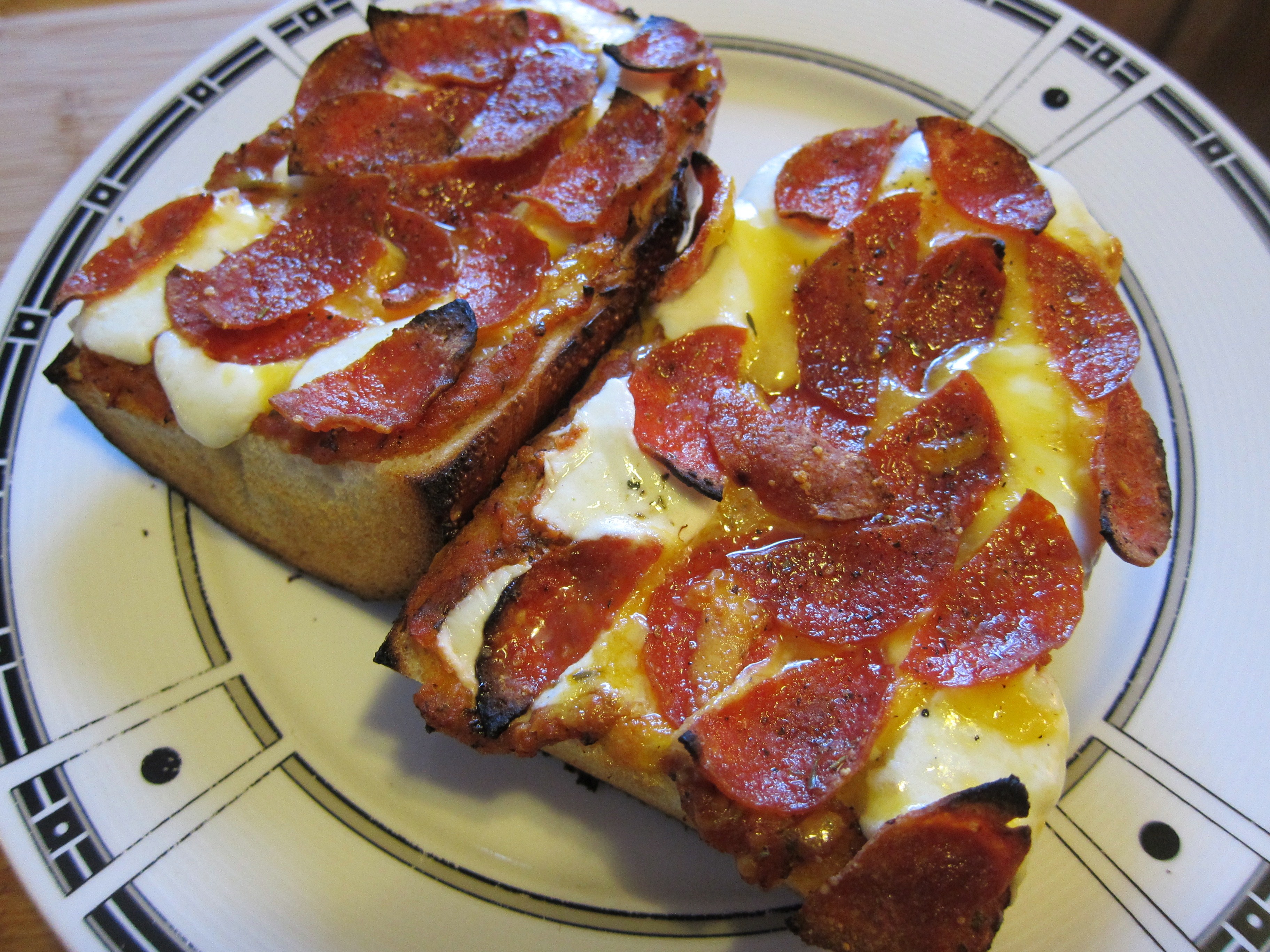 Griffin posted recently on french bread pizzas. Took a few tips from the post and gave them a whirl.