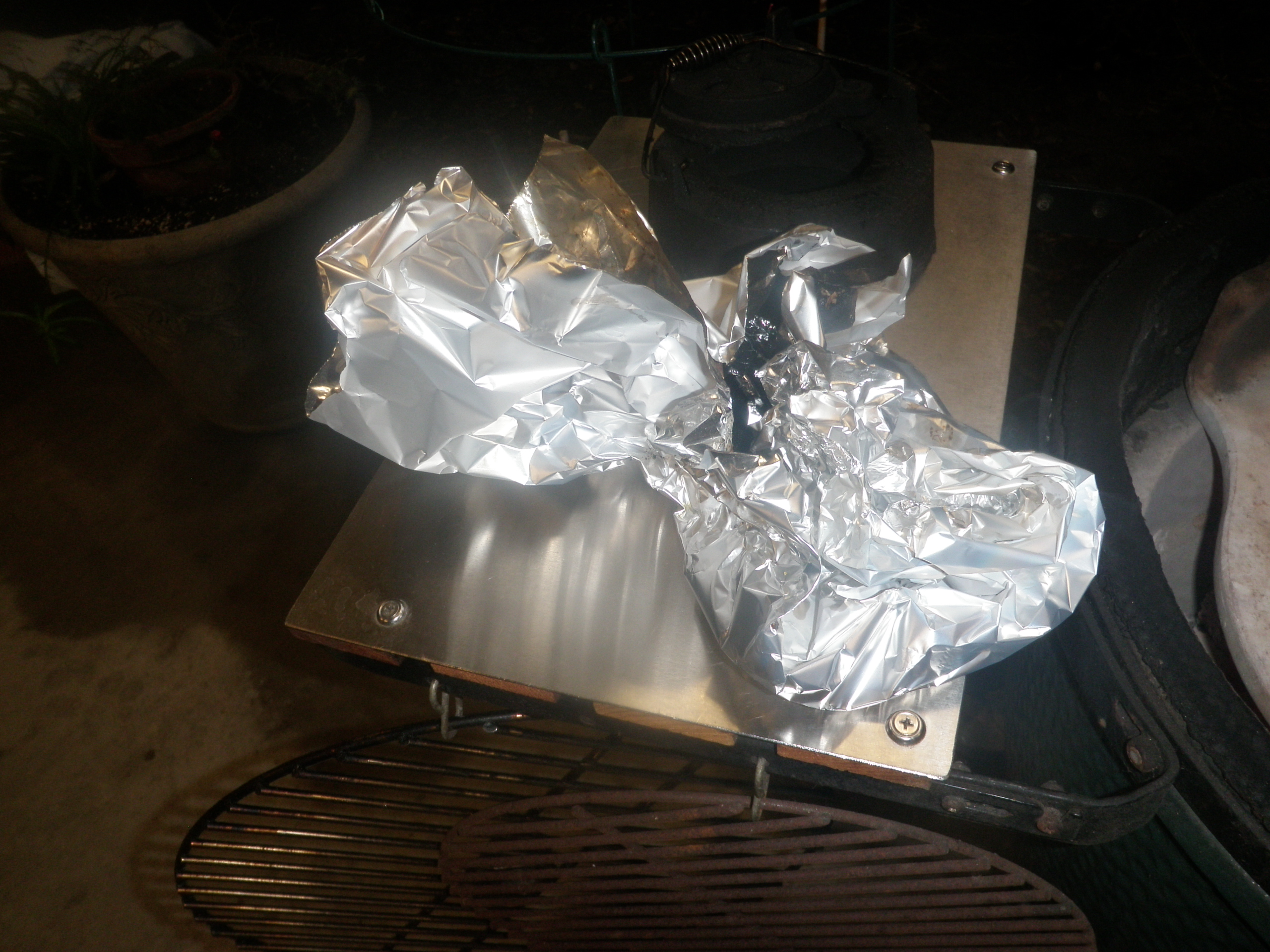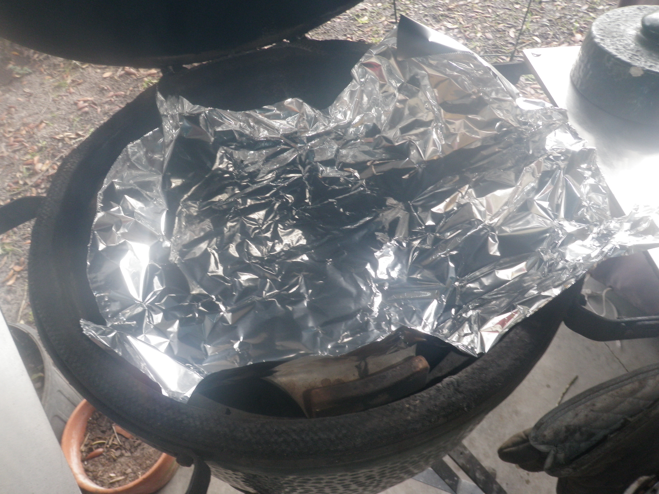 1) i use a piece of standard thickness foil across my plate setter and onto the one edge of my egg which protects my probe wire when used.  I form some sides on the foil to catch the drippings.  Since it is "ON" the plate setter any liquid is going to burn off and not puddle up.