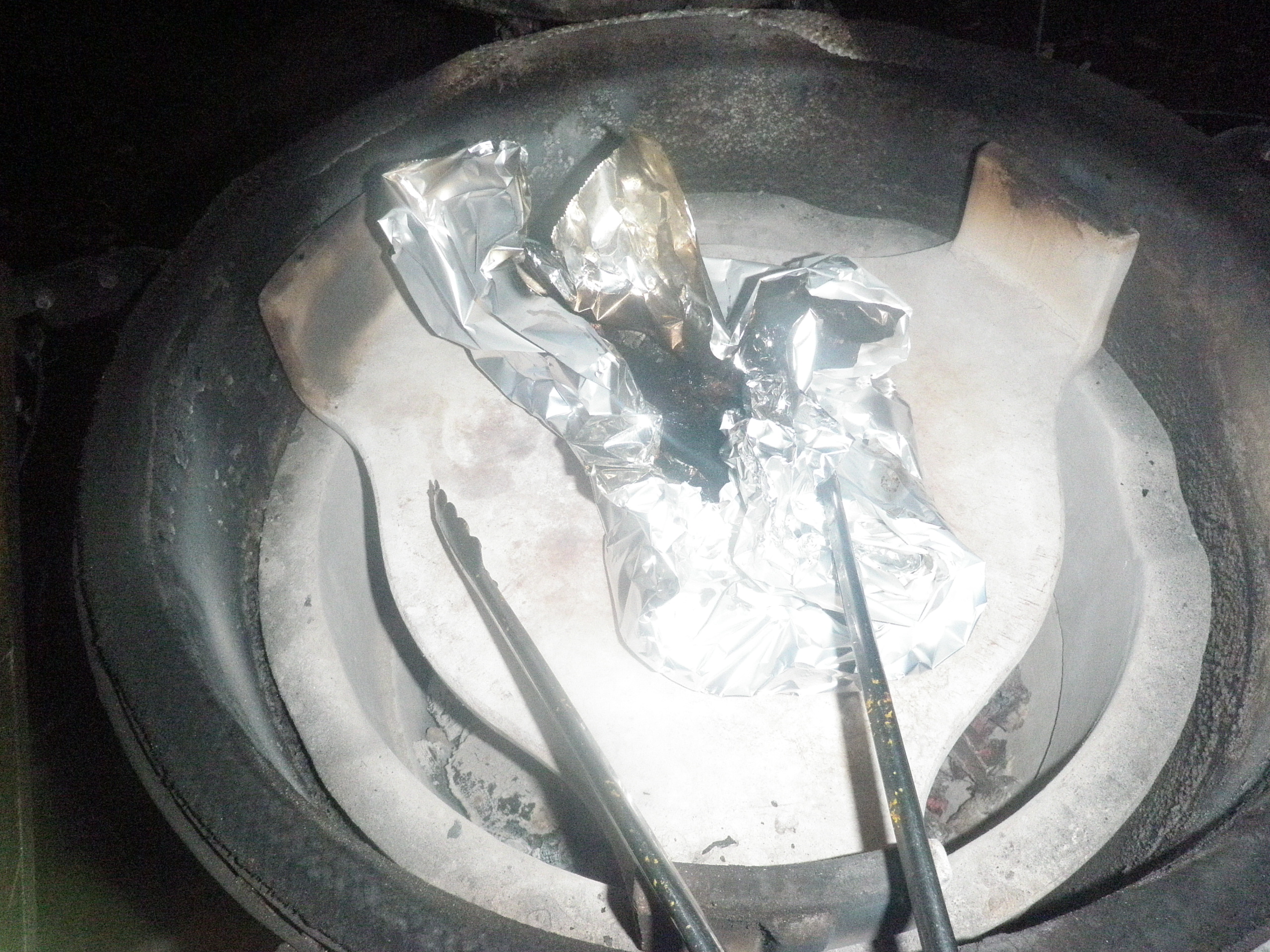 3) I use my tongs to wrap up the foil, and set it on the shelf for a minute to cool off.