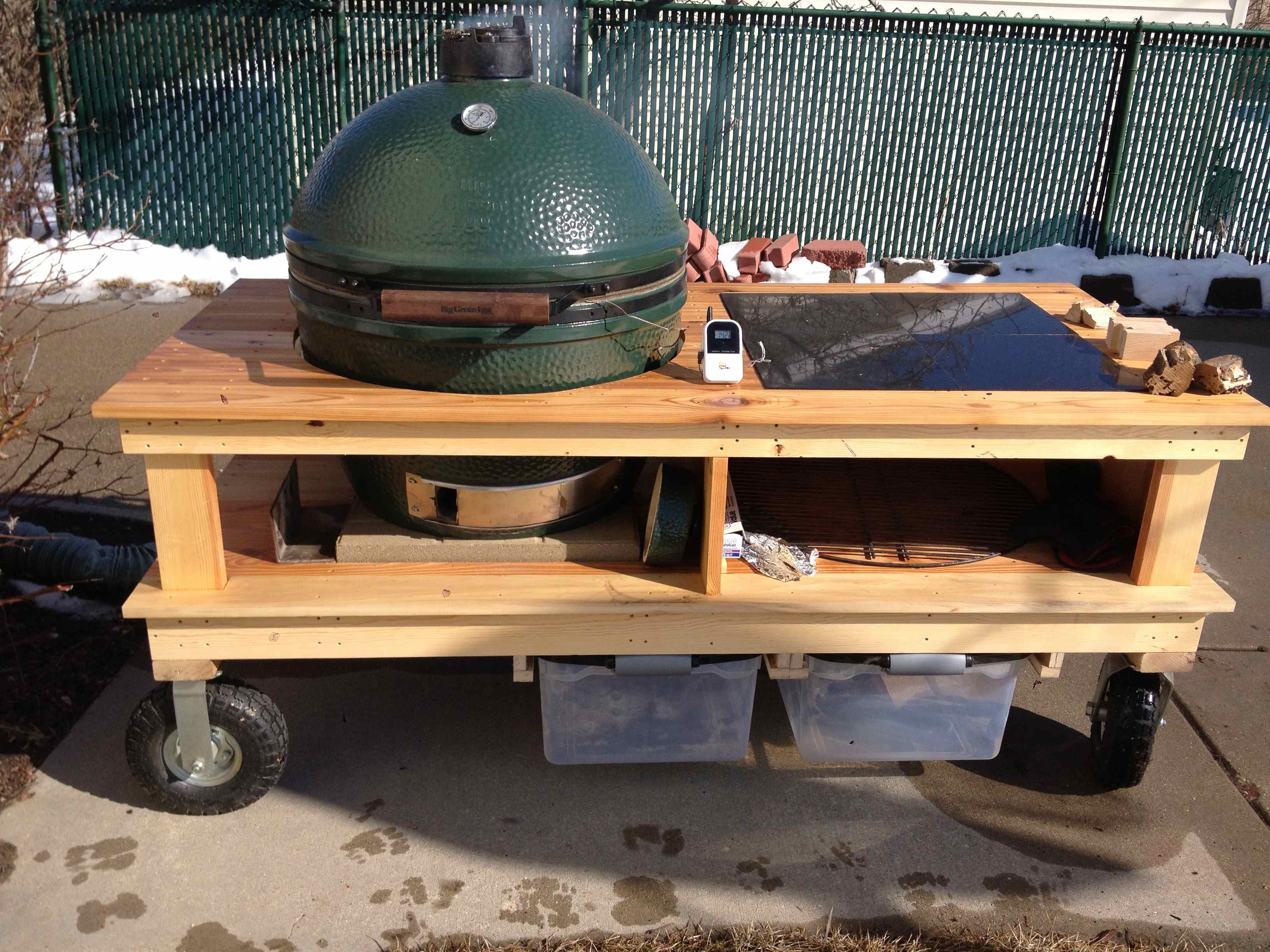 Finished the table for my XL this week. Didn't have the money for wood so I used scraps from the shop. The frame and bottom deck are pine, and the top deck is cedar. Total cost of wheels, fasteners, granite tile, and finish was $175. Someday I'll rebuild it in longer lasting wood (white oak or something similar; maybe cyprus). Ribs and beans shared with friends seemed appropriate!