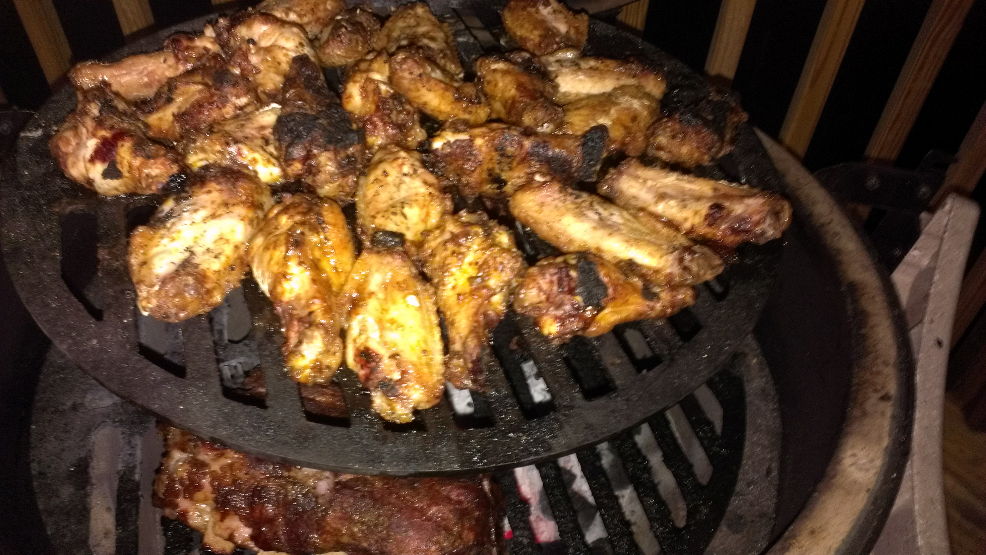 Off to publix and got some fresh baby backs. Rubbed with a tad yellow mustard, DP dust, and on the egg it went. Did 3-2 and about 15 min open. It was so so so good!!!! Super fall off the bone tender. Somewhere, while on Maker's 46, decided there was too much of the frozen wings in the freezer and got them thawed, rubbed and on the egg, after the indirect phase was done and the smoke had cleared. Came out really well.
