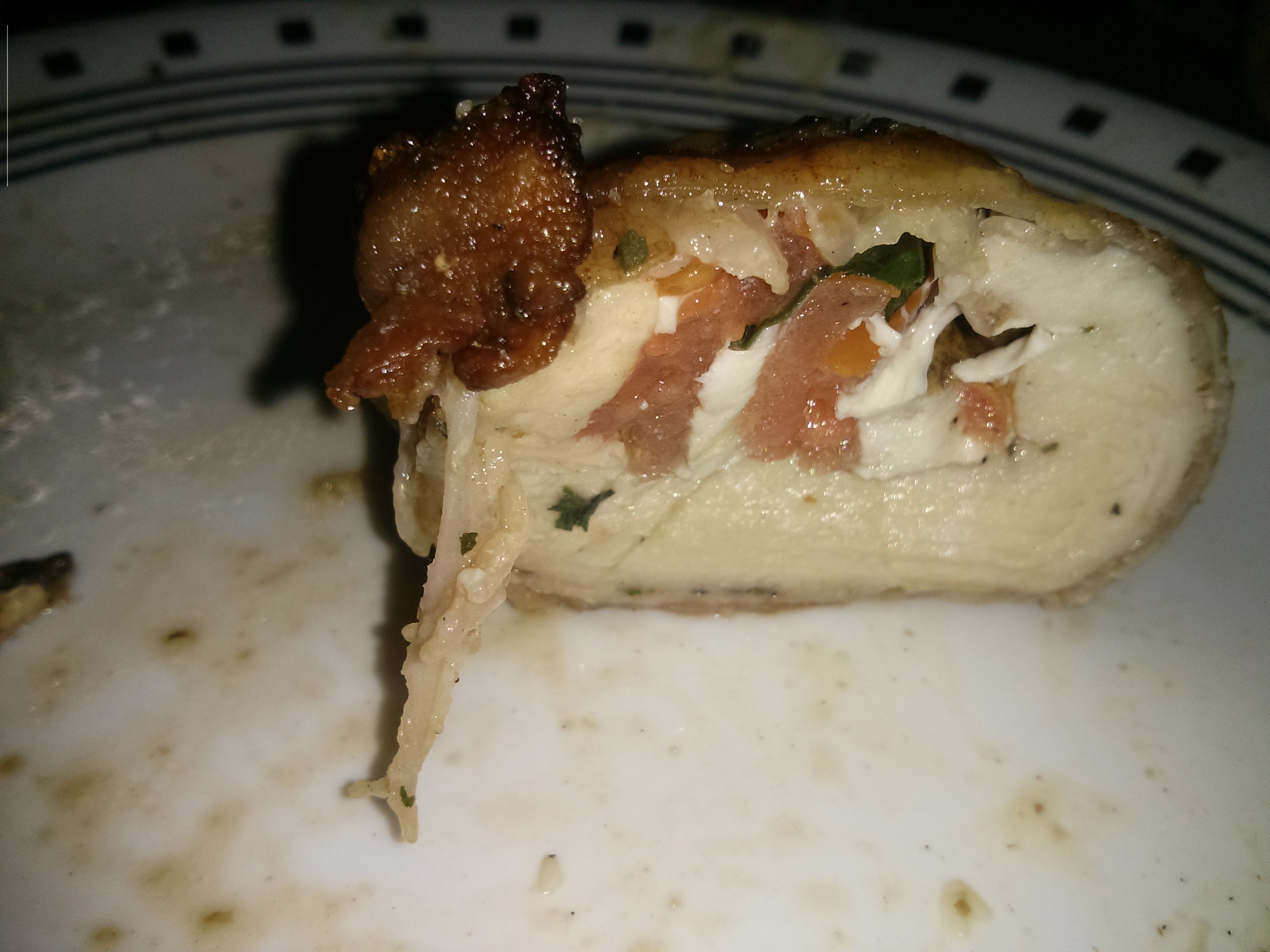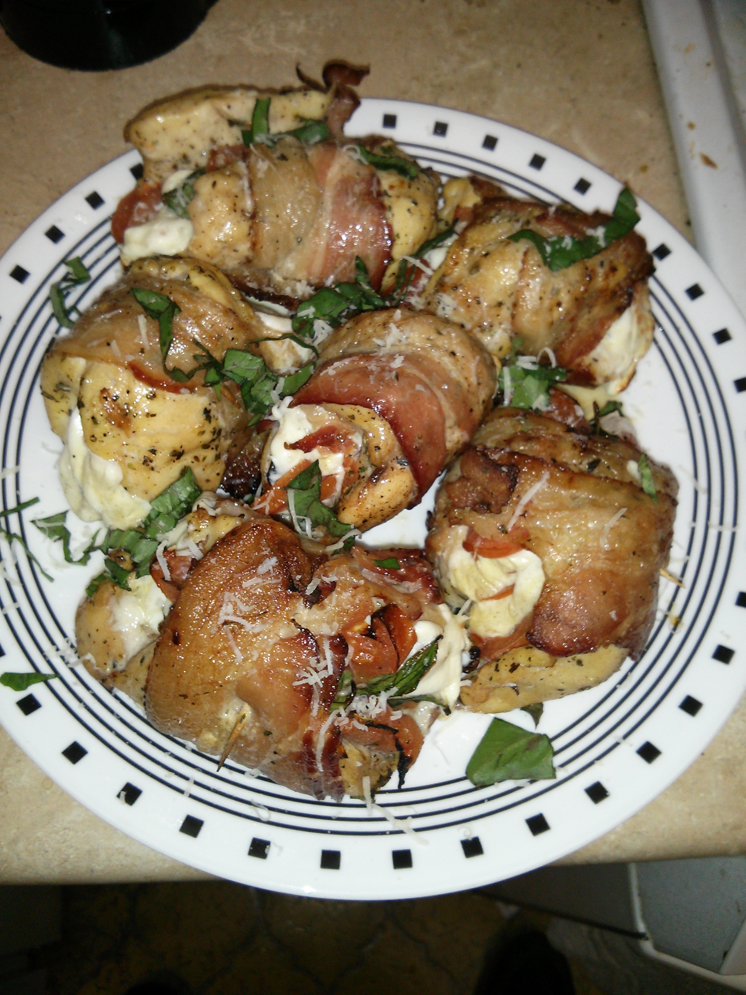 They were very good. Meat stayed very moist and tender. Now we just want to figure a way to make bacon even crispier without melting all the cheese out. I would recommend everyone stuff something in a piece of chicken after wrapping it in bacon.