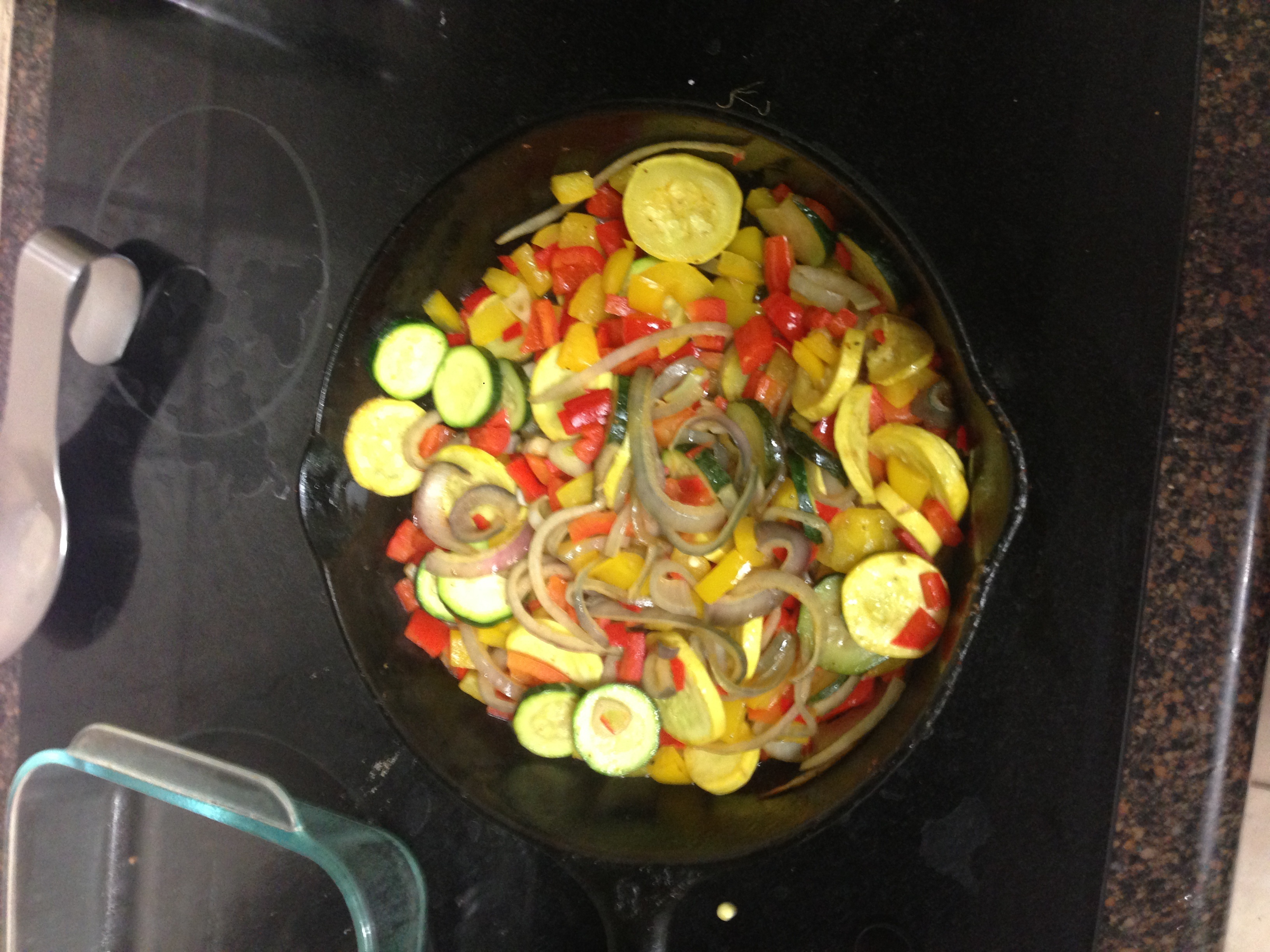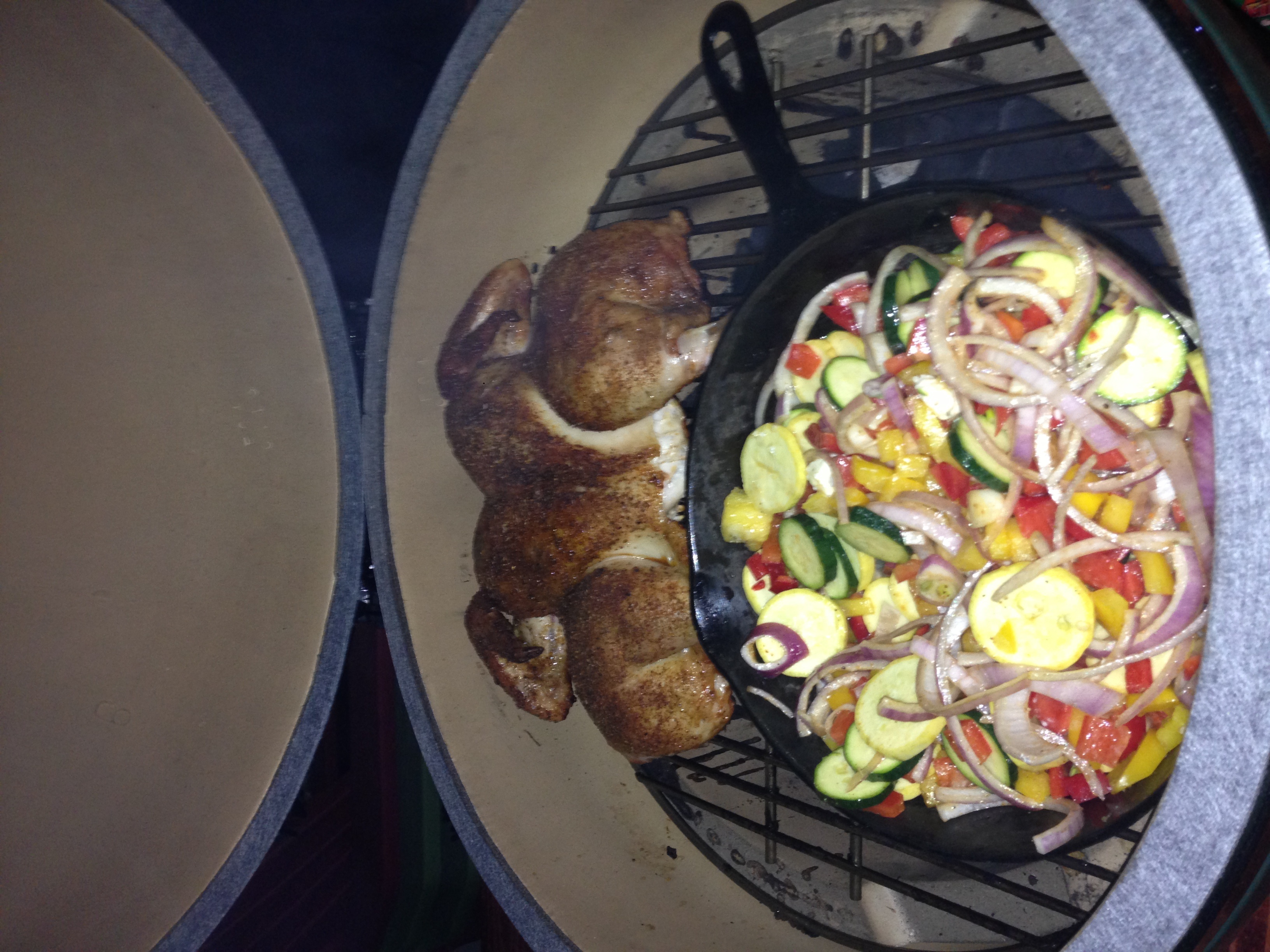 It was a huge success with the friends and SWMBO. By far the best chicken I've ever cooked and probably ever had. Did some yellow squash, zucchini, red pepper, yellow pepper, purple onion, Fresno pepper medley in the CI skillet as a side.