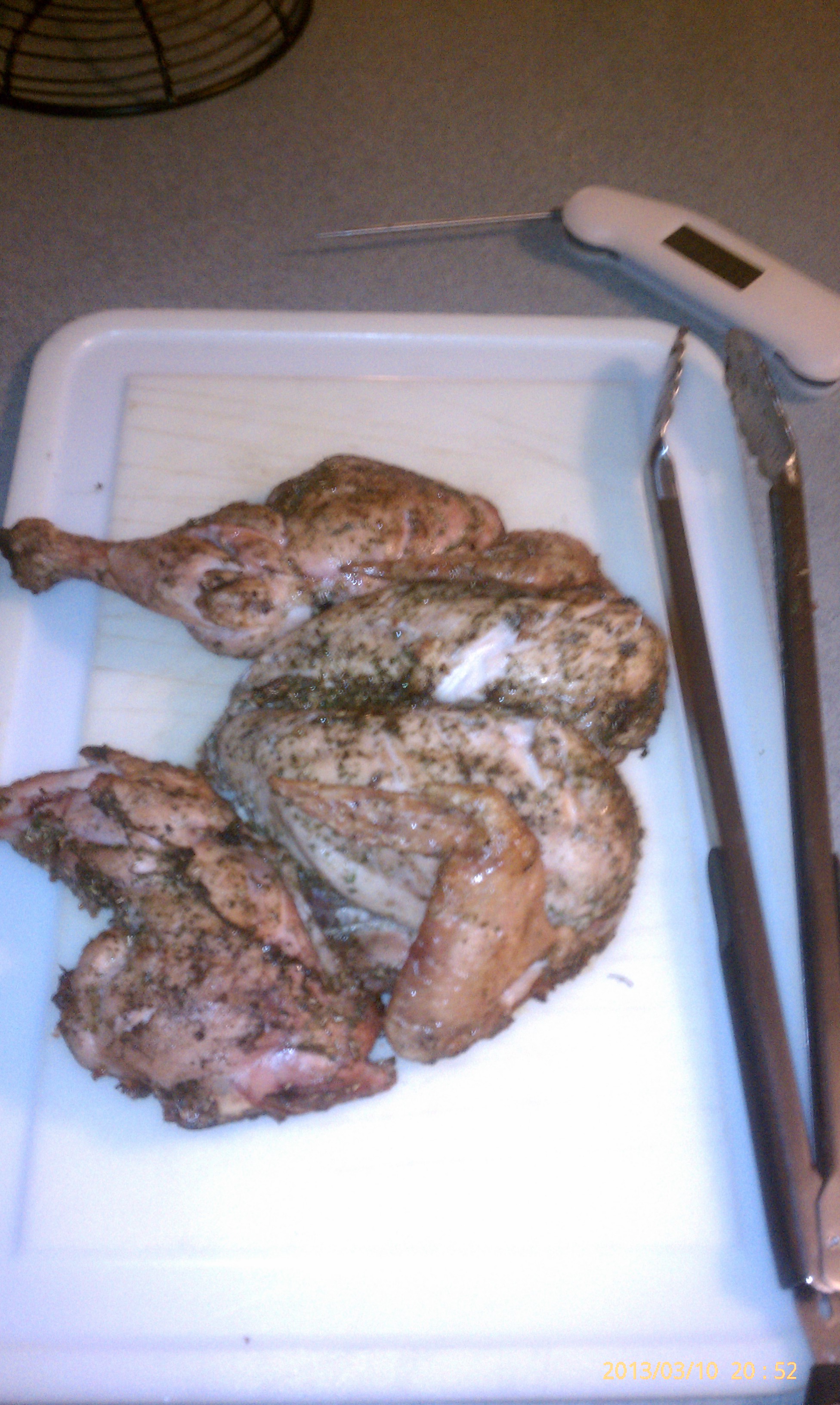 I always cook mine breast side down for 10-15 minutes, then flip for the remainder of the cook. BTW, this bird was skinless. I've been removing the skin on them lately and like them better than with the skin on. It is just as moist and more of the rub gets on the chicken.Mark Annville, PA