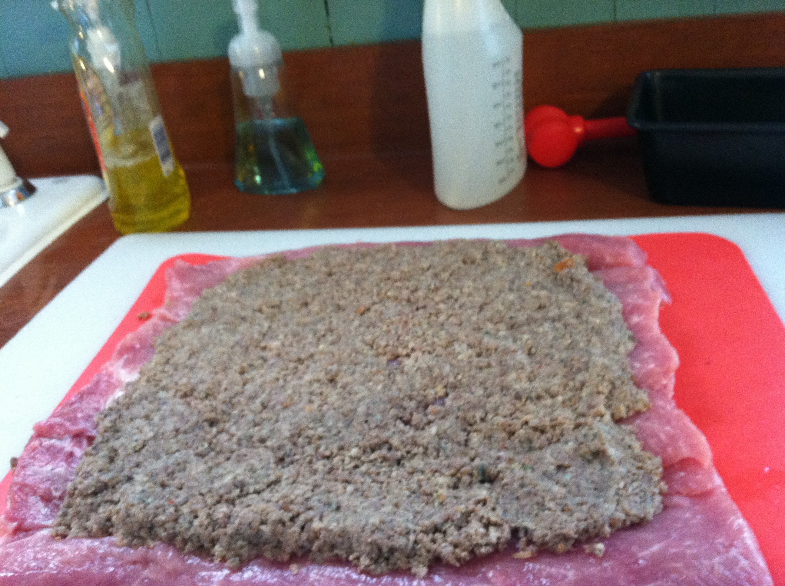 Stuffing consisted of sausage cooked and drained, minced garlic, cheese, pepper flakes, an egg and a slice of bread for binder. I added some fresh thyme. Mix all in food processor to make it easier to spread. I forgot to add the cheese in when processing but it didn't hurt to have in on top. Rolled and trussed back in fridge overnight with rub.