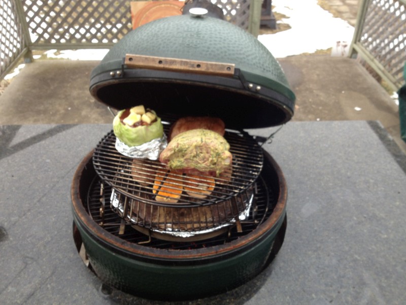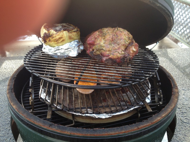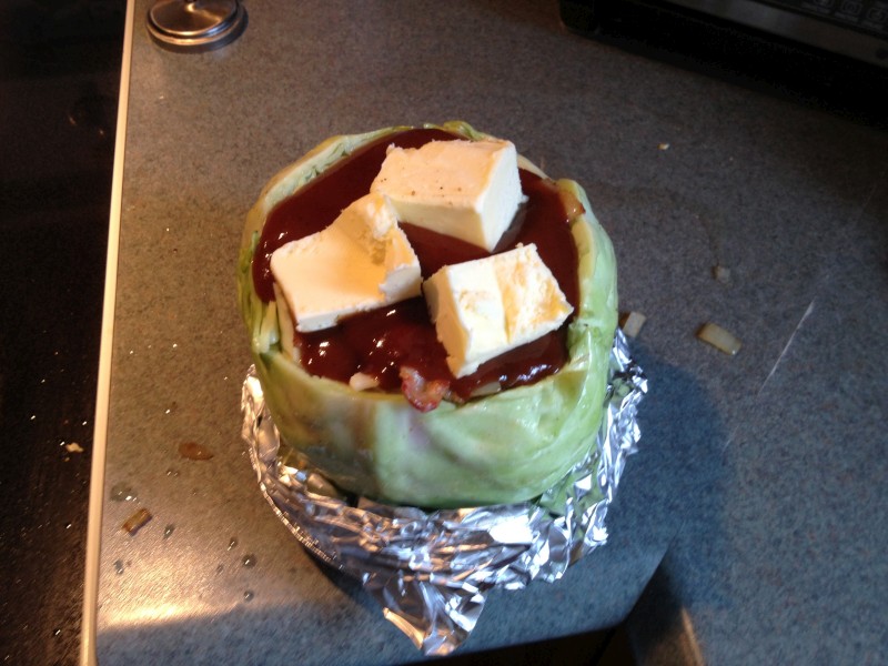 Everything was great, but that cabbage stole the show. Pictures will speak for themselves, but basically: cut the core of the cabbage, make a nest for it with aluminium, fry some onions with bacon and fill the cavity. Top with bbq sauce and few chunks of butter. Easy money! Source: Steven Raichlen book I believe