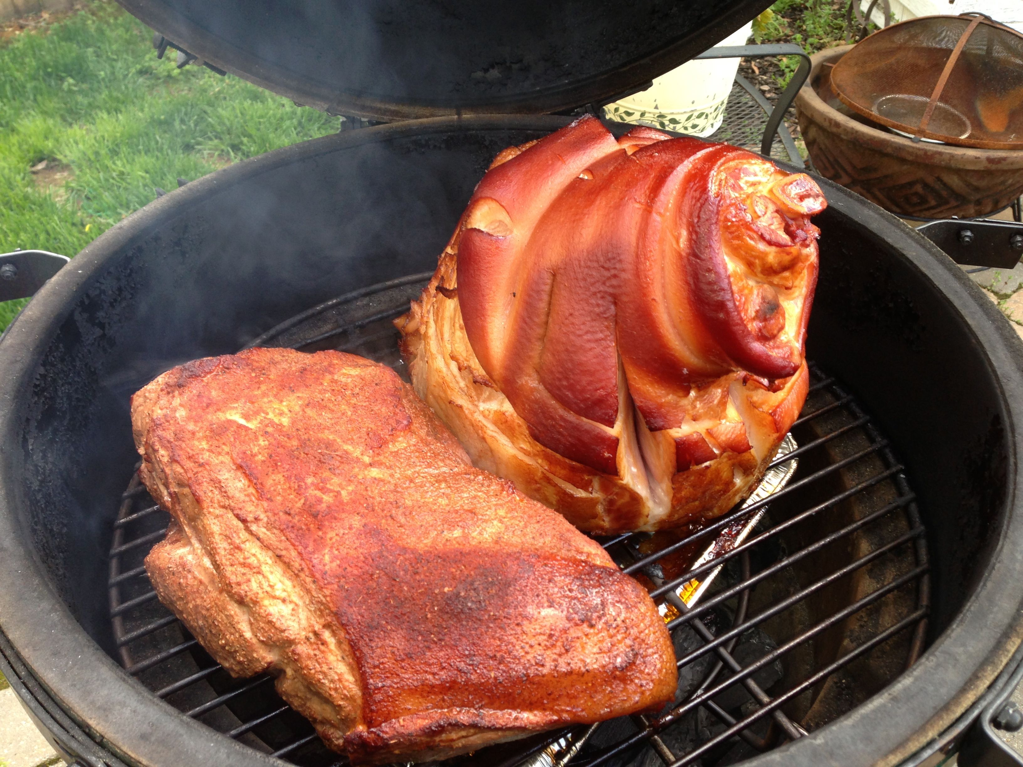 Bonus #3: last weekend cooked a pork butt for a potluck at work while smoking a ham for the family. This pic is at the halfway point.