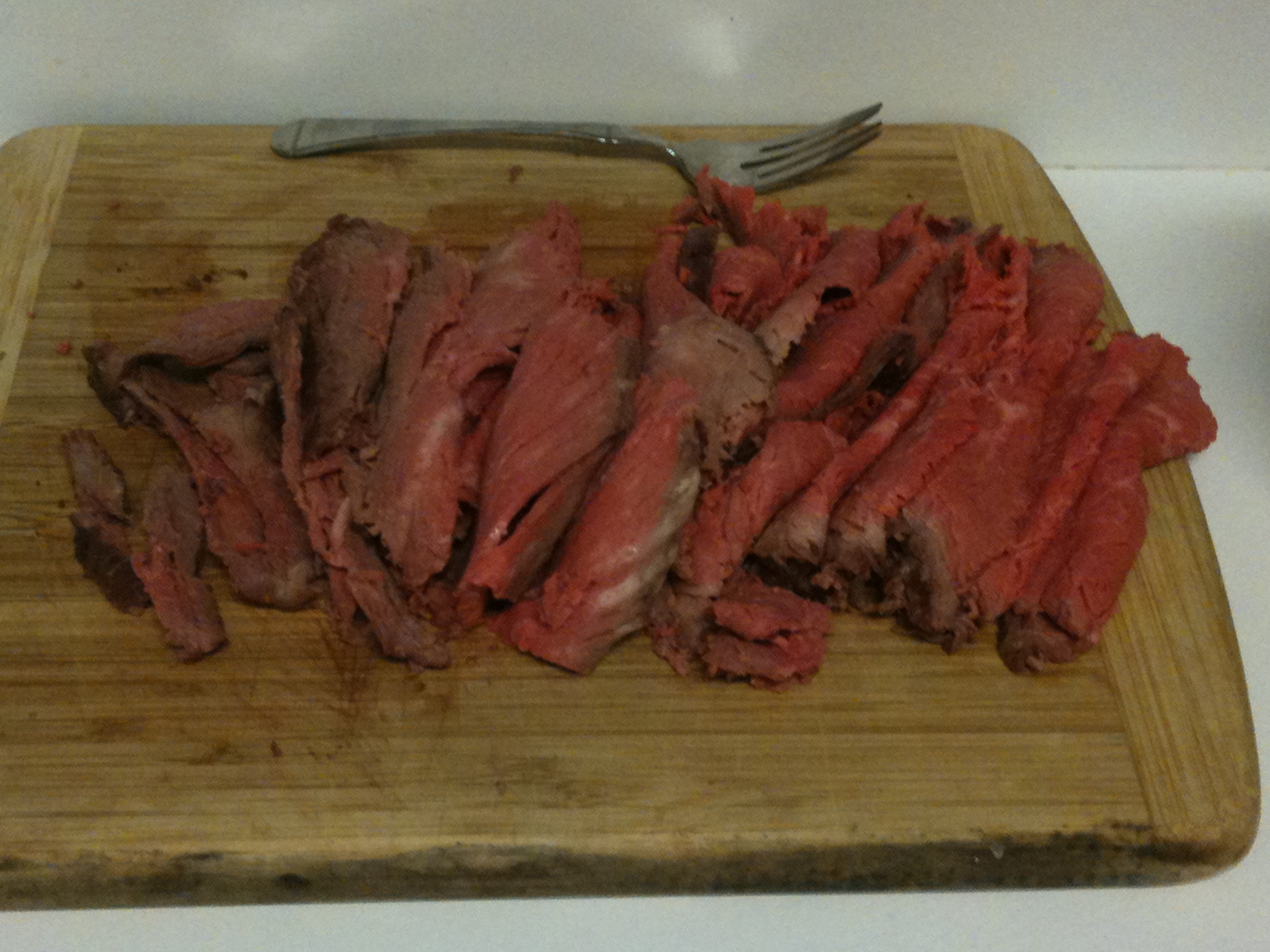 Local supermarket had a bogo on bottom round so I picked up a couple so I could do some deli-style roast beef.  Light dust of s/p, cooked indirect at 300 until internal was 125.  Foiled and tossed in the fridge.  Manual slices but came out pretty decent.  Also made the Aaron Franklin BBQ sauce.  Had a nice tangy sweet flavor but I found the onion to be a bit prominent, so I'll cut back next time.  I substituted chipotle chili powder as it was all I had on hand; also felt it was heavy on the butter, will most likely cut that in half on the next run.