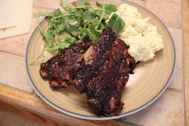 Mothers day and SWMBO wanted ribs! Pulled the membranes and rubbed them down and got them cooking then threw together some chicken bombs for appetizers. I had to enjoy a few frosty beverages, The bombs were awesome. Ribs plated with a simple salad and some potato salad. Thanks for looking!
