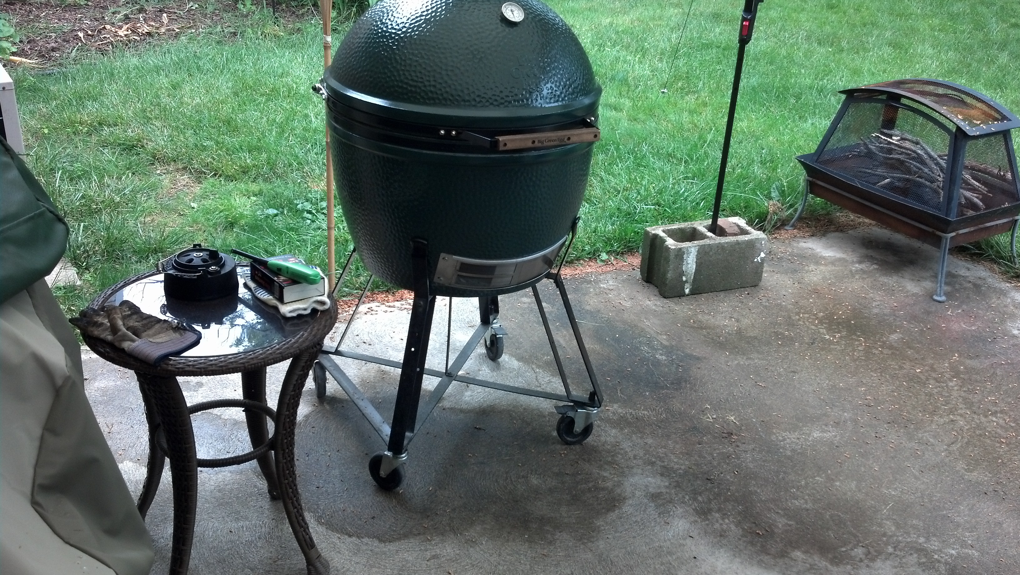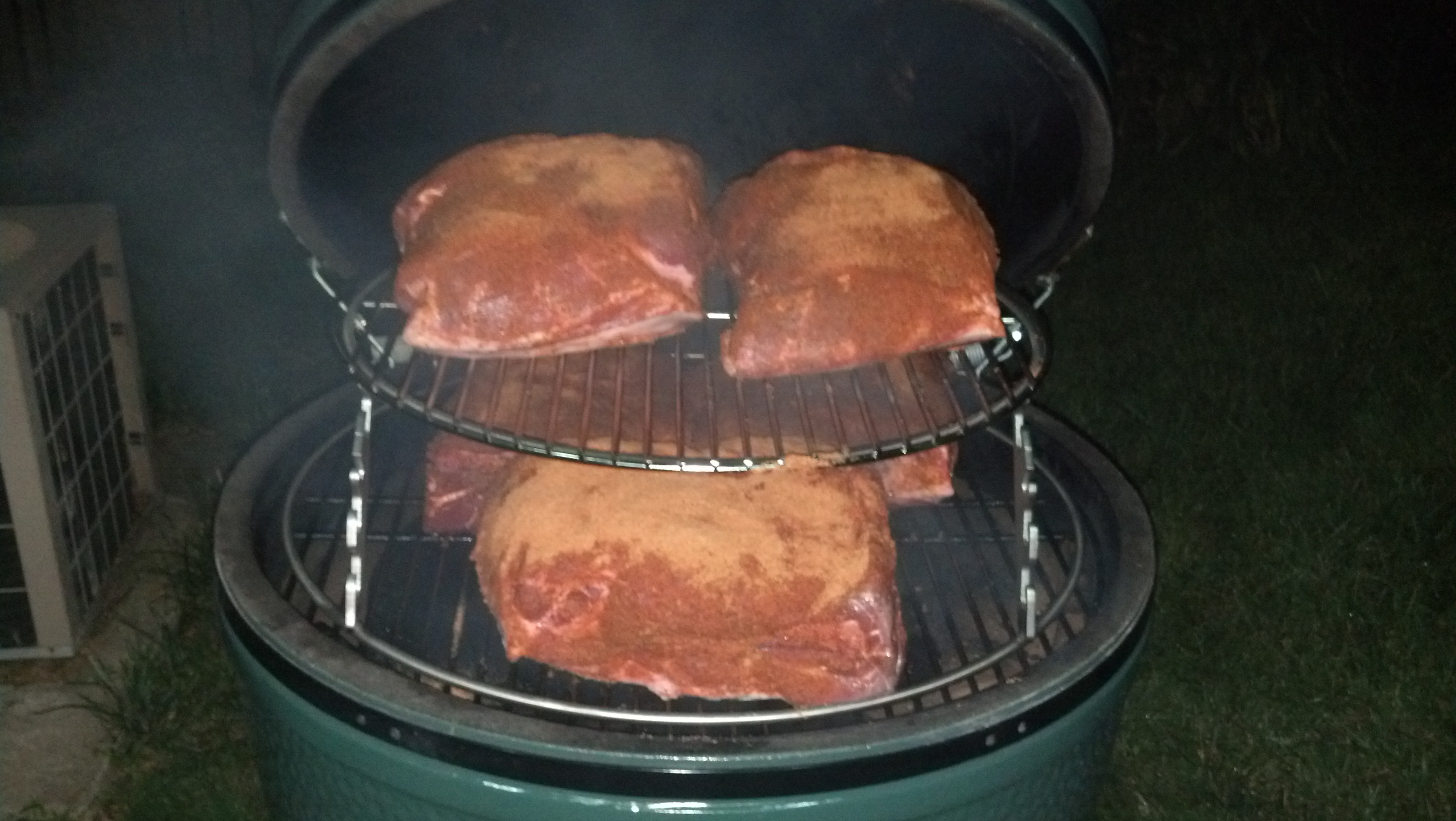 I did have one major mishap though.  In my rush and nervousness I didn't put a drip pan in the cook.  I had picked one up at the store, but the tub was too deep and wouldn't fit between the platesetter and the grid.  This was all fine until the last couple hours of the cook. Some fat had dripped over the platesetter on to the coals and I had a pretty nice grease fire going in the back right of my Egg.