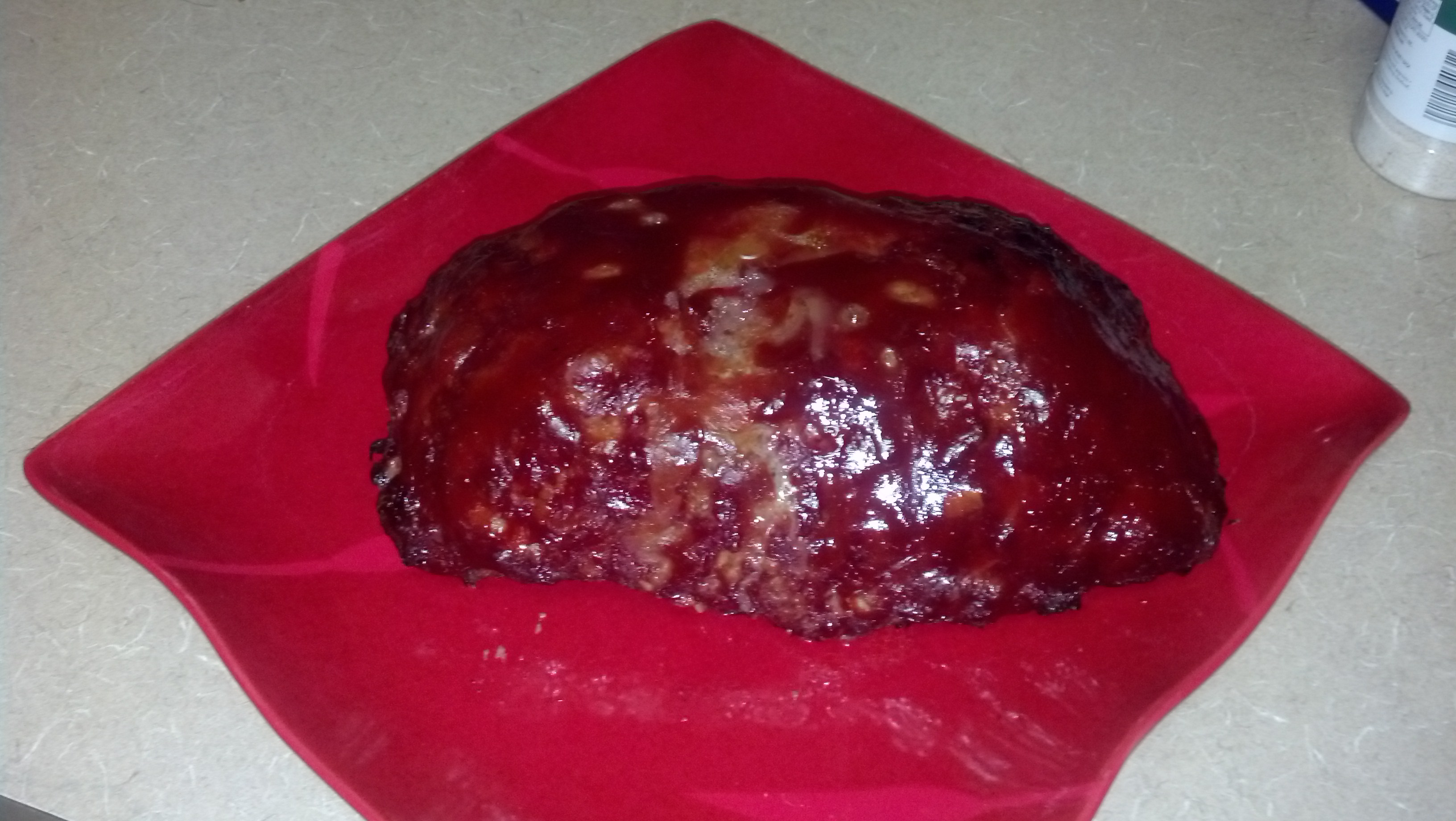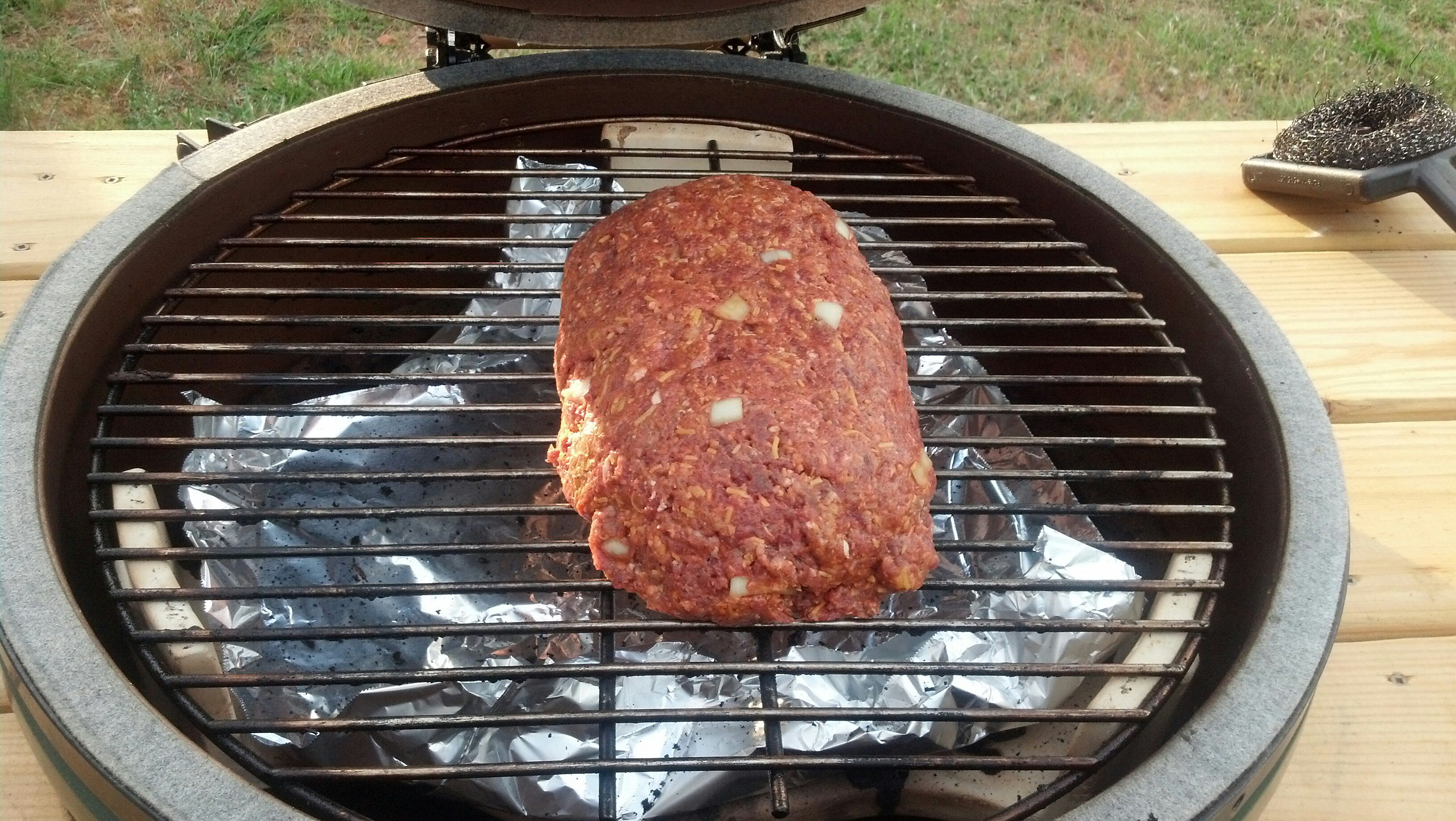 1 1/2 lb ground chuck, 3 slices of crumbled bread (you can substitute crushed crackers for the bread), 1/2 medium sweet onion, 4 oz of graded sharp cheese, 1/2 cup finely graded carrot, salt, pepper, 1 egg and 2/3 cup milk.  Topping:1 Tbls mustard, 1/4 cup ketchup, 1/4 cup brown sugar.  Add the topping after the temp is up to approx 130.  Cook indirect at 260 until internal temp is 160.