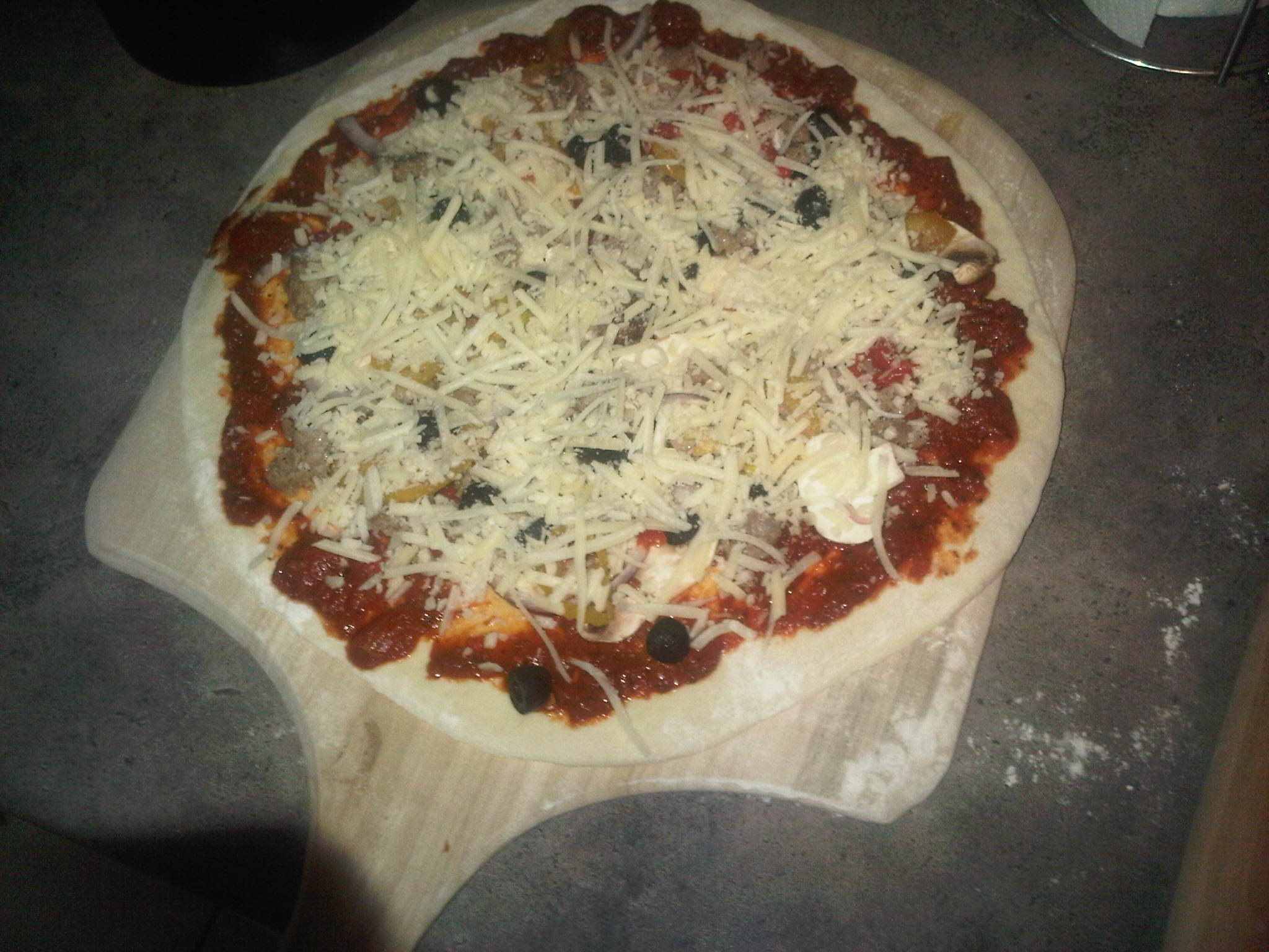 Did pizza for the first time last night. I used some of my sourdough starter to make the dough for the crust and it was fantastic! The crust had a wonderful flavor and was crunchy on the outside but still a little chewy on the inside. Did two pies with just basic toppings... mushroom, black olives, sausage and hot peppers (and one 1/2 just pepperoni). Baked each pie for 10-12 minutes on our pampered chef baking stone. The initial feedback was that "this was the best pizza we've ever had!"