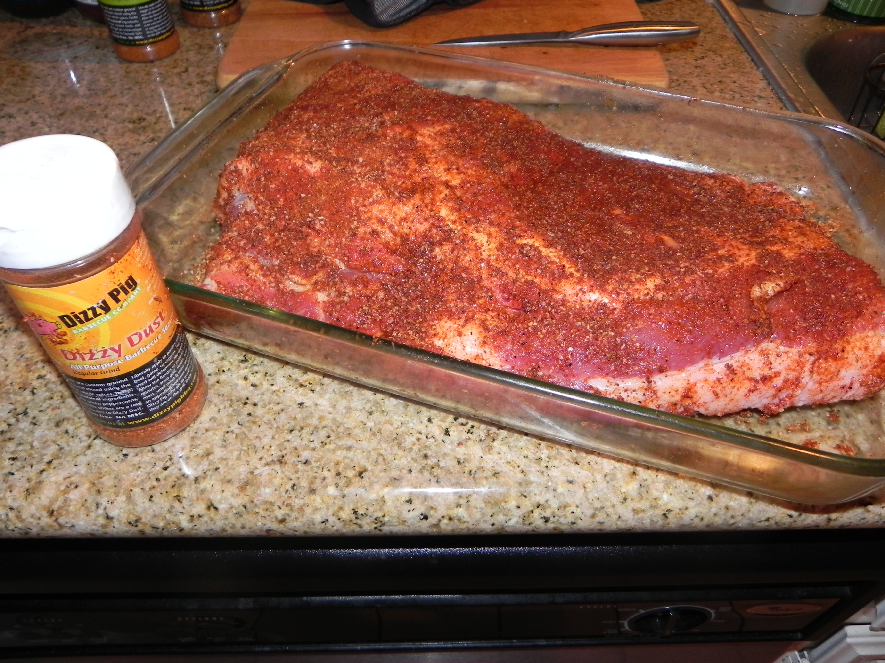 Doing a large untrimmed rack of pork spares as well. I mention untrimmed because I've been wondering how things will go if I cook first and trim later, so I'm giving it a try. These were rubbed with DP Dizzy Dust.