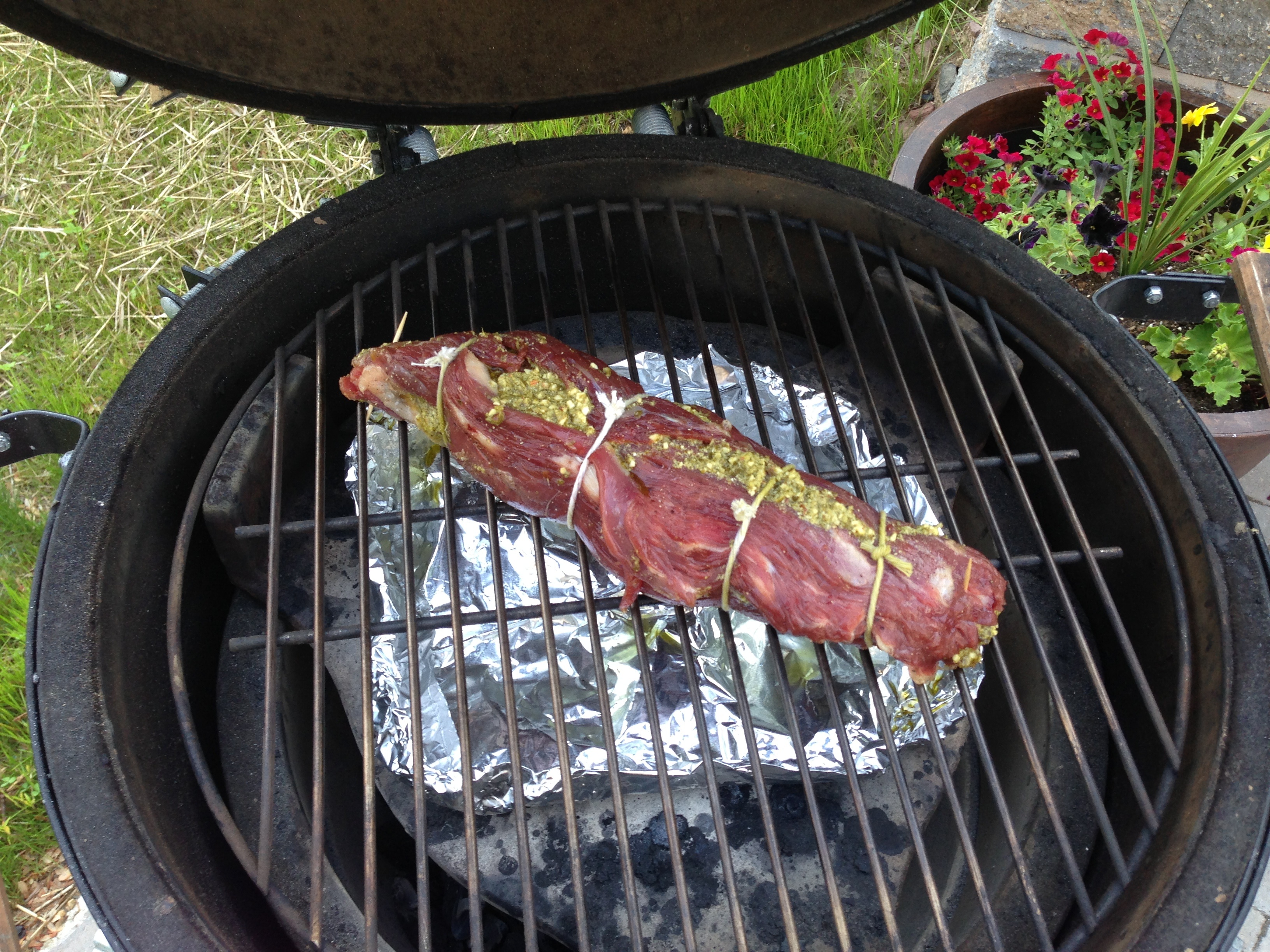 Did some pesto stuffed flank steak last night. Tasted great. Just salt and peppered the outside, then butterflied it, and layered pesto sauce on inside. Rolled and tied it up, then threw it on Egg indirect for about 50 min. Only thing I wished I'd done differently was pull it off 5-10 min sooner. Most parts of it turned out medium well to well done. Just hard to get an accurate temp reading when it's stuffed.