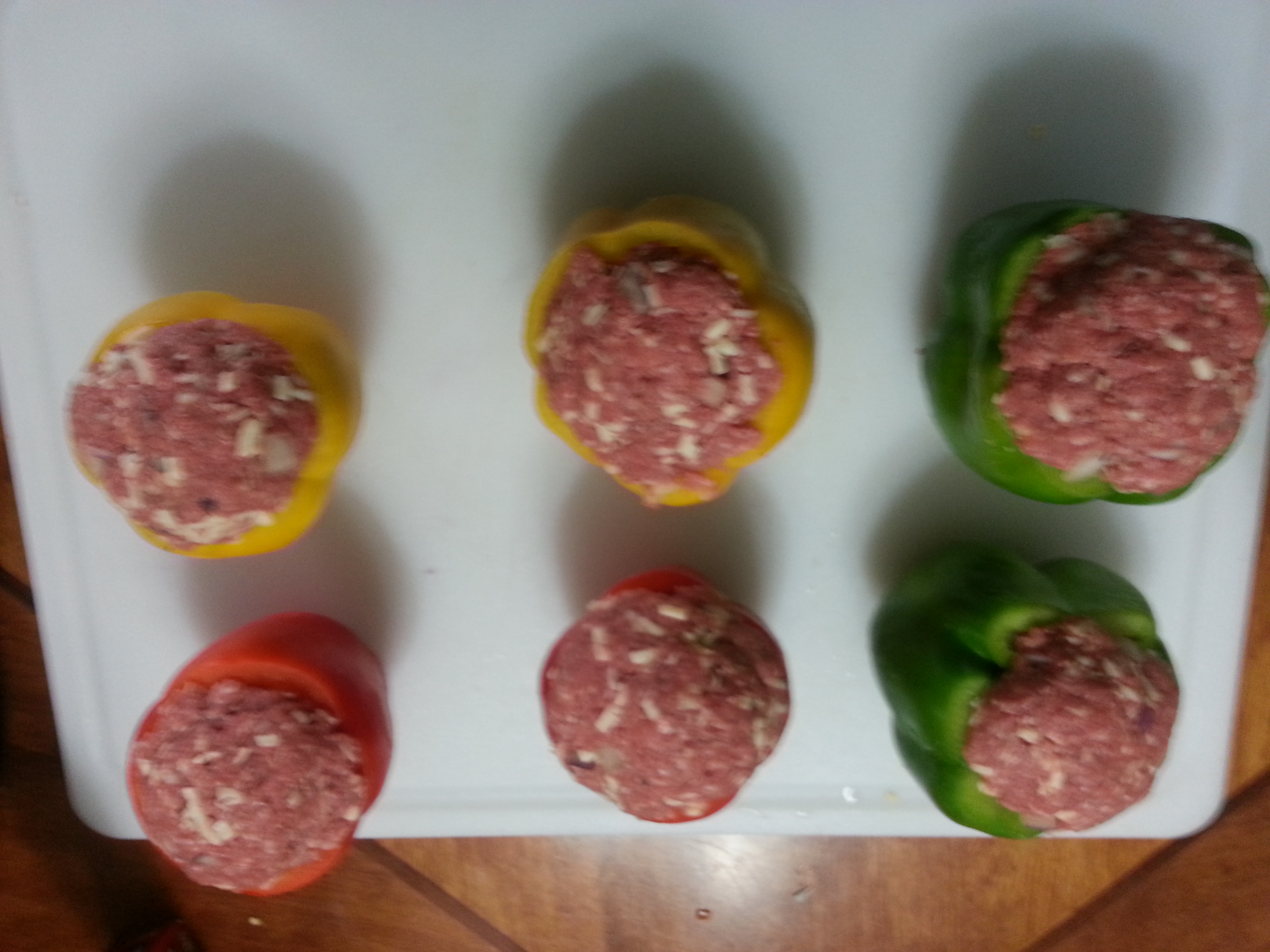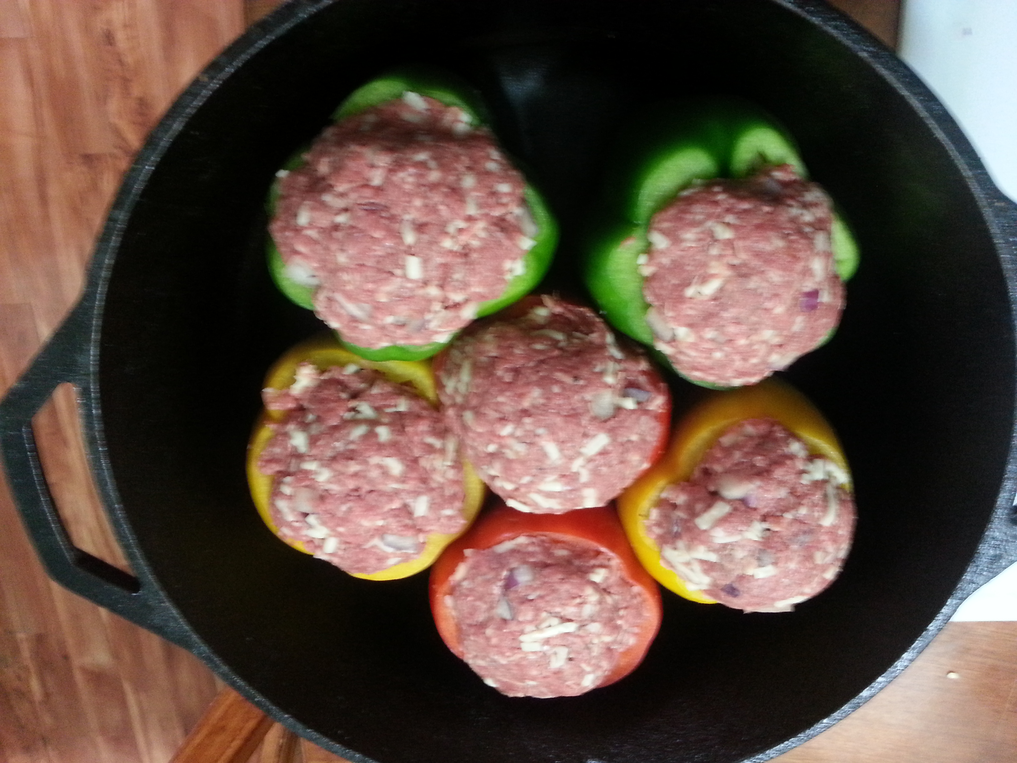 Have never done these on the egg before so today was the day for it . Six bell peppers stuffed with ground chuck mixed the meat with some raising the steaks , diced red onion , rice and mozzarella cheese and stuffed the peppers full placed in the ci dutch oven and poured a vinegar ,garlic ,tomato sauce over them and a few crushed cloves of garlic on top of the sauce hoping to been done around 5 for dinner .thinking of red skin garlic mashed potatoes and mixed veggies as the sides . last pic is about a hour into the cook simmering away on the egg