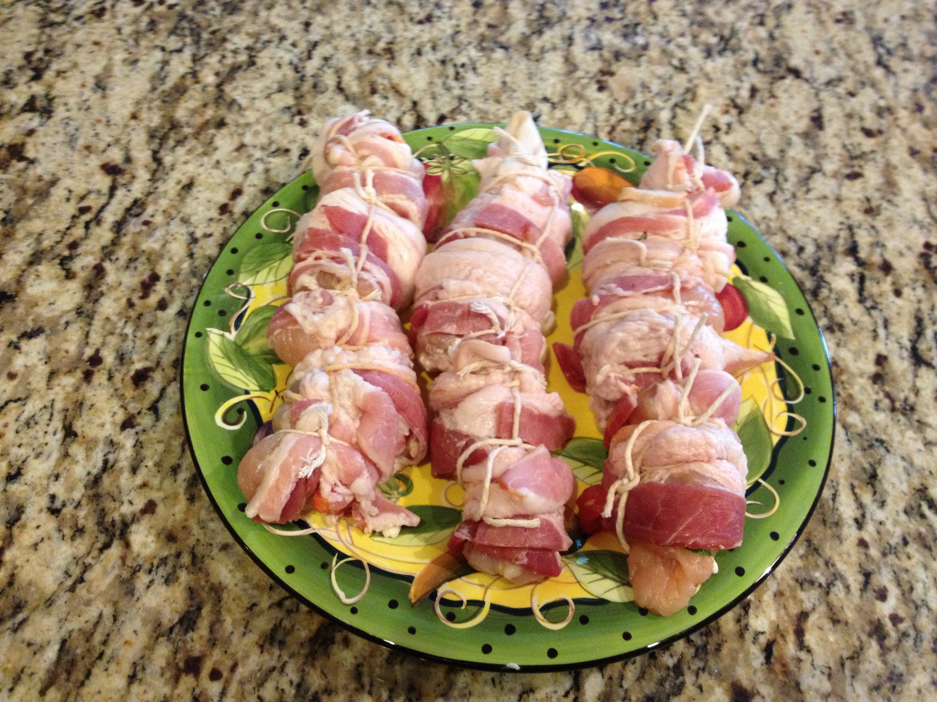 Kudos to the Mickster for his recipe. I modified it a little. Used tomato, basil, moz on two and the goat cheese, japs on the other. Had leftover tomatoes so I put them on the goat cheese as well. Just put the fillings on the filet like a taco and wrapped all in bacon. Easy and damn good. The corn in the husk was to die for.