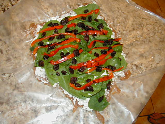 Pic 2 has the fresh spinach with roasted red bell pepper and dehydrated cherries. Then tucked, rolled, and tied.