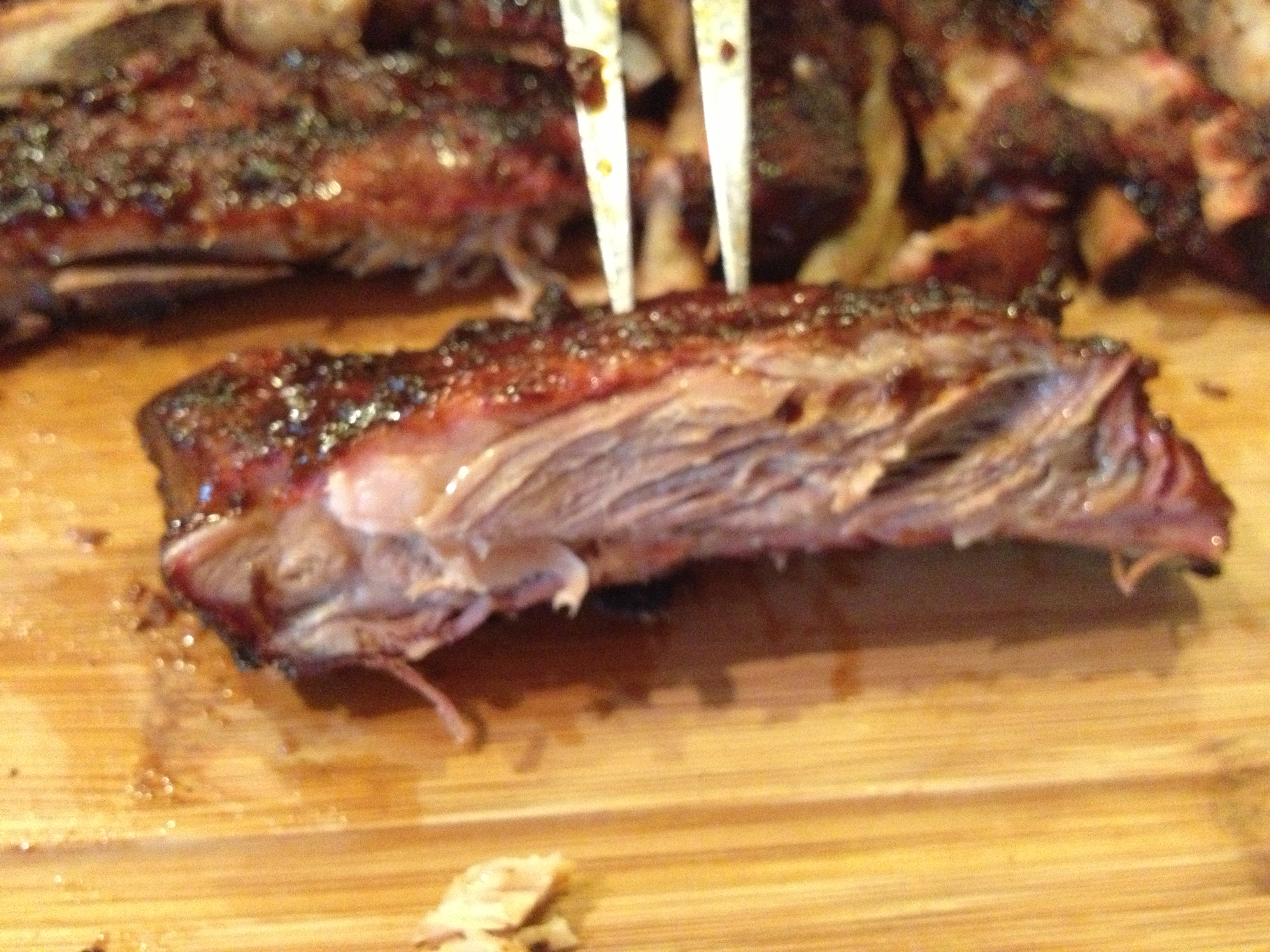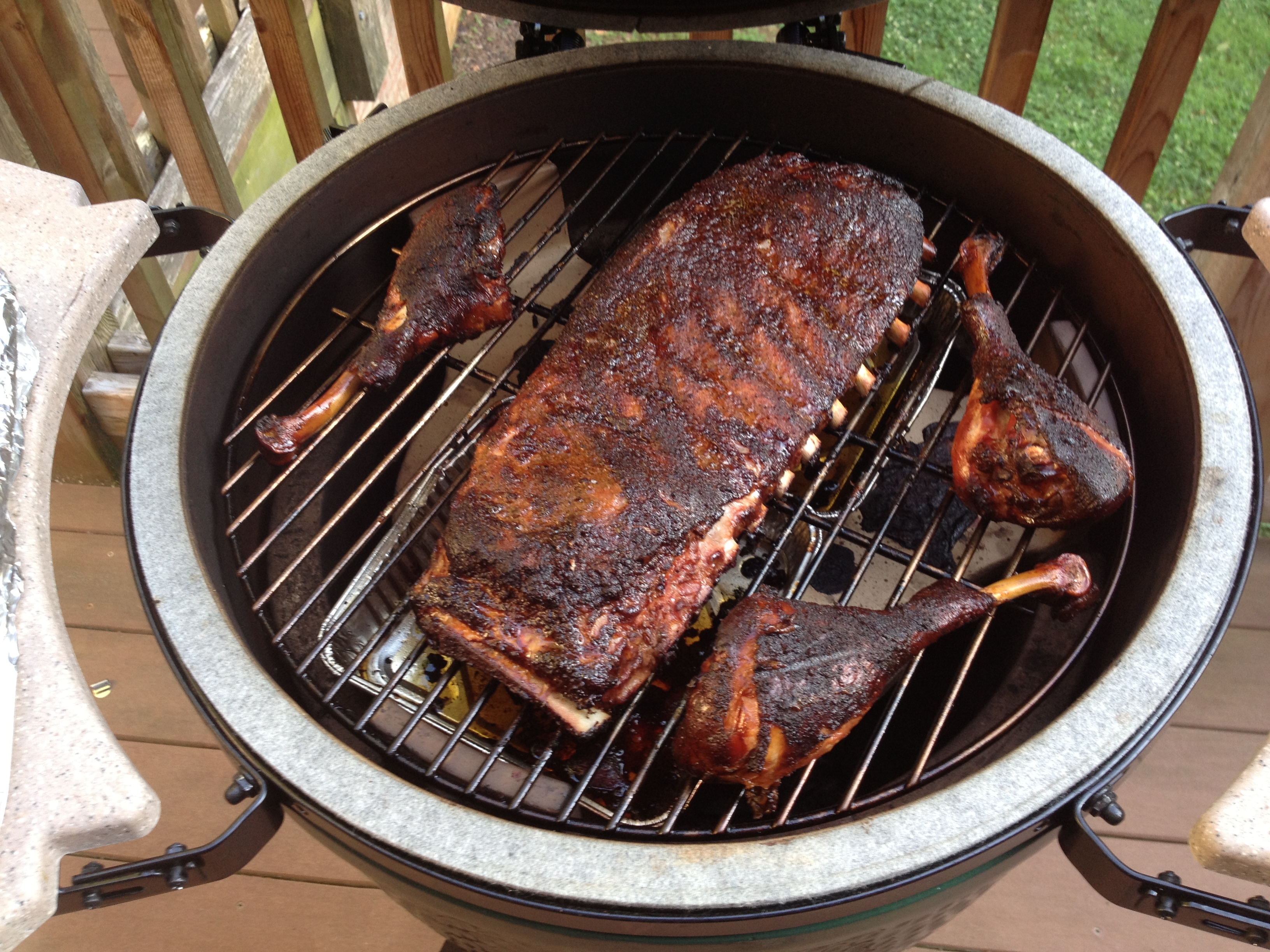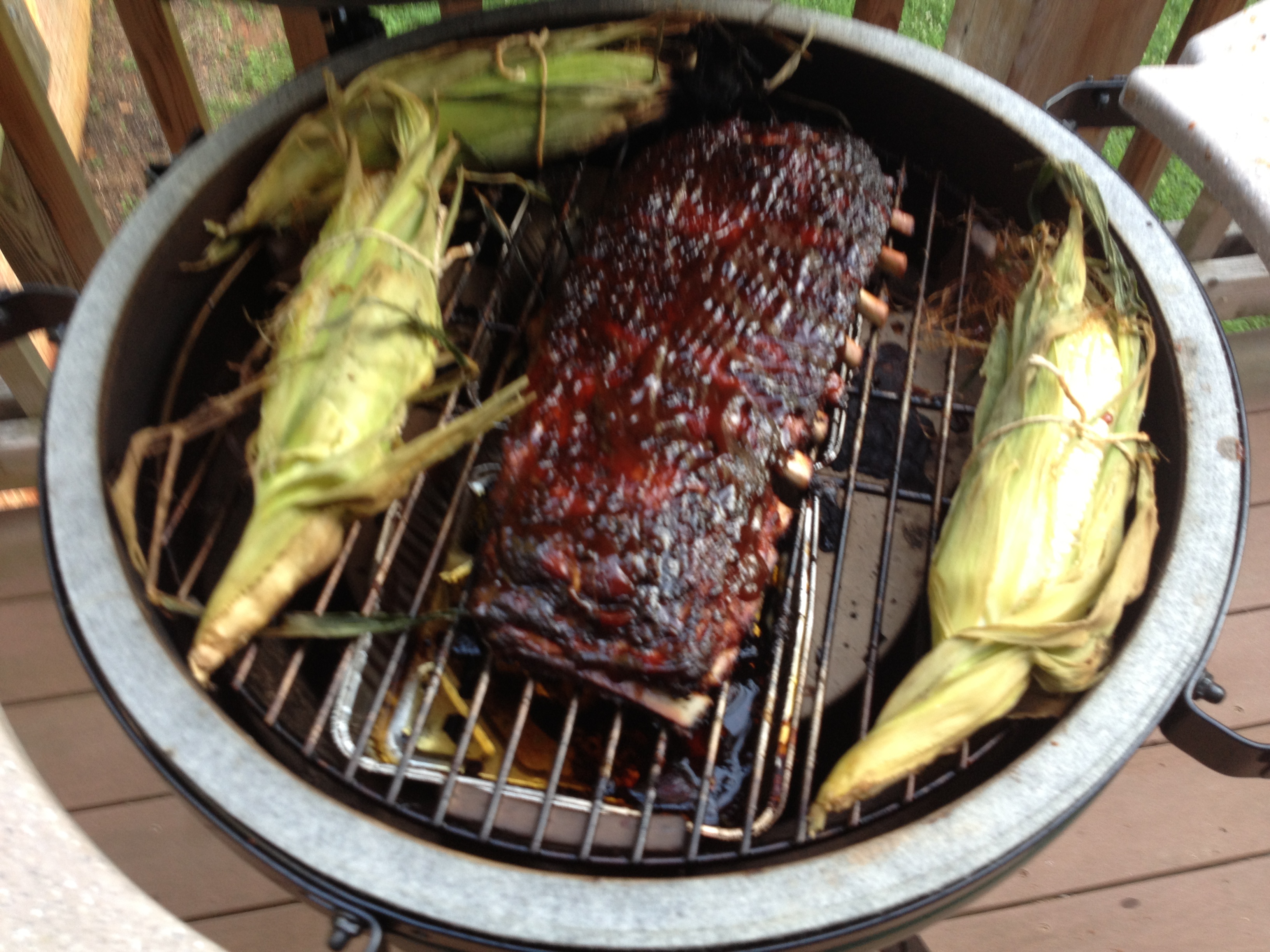First rack last night on the LBGE. Foraged around the threads and settled on a Travis-Style variation (Would have asked him for advice but heard he was busy with Miss Sapphire from Bombay). Lost some time because the ribs were bad and my wife had to run back to the store while I prepped the Turkey Legs. Ended up at about 270 for 3.5 hrs with 3 big apple wood chunks then sauced em up with Sticky Fingers 15 min before I pulled them off. Ribs were great. I could have pulled the legs 30 min sooner but they were very good too. After 4 attempts, I have the corn-in-the husk thing down. Put the Stubbs on the legs and the 3 beer on the ribs.