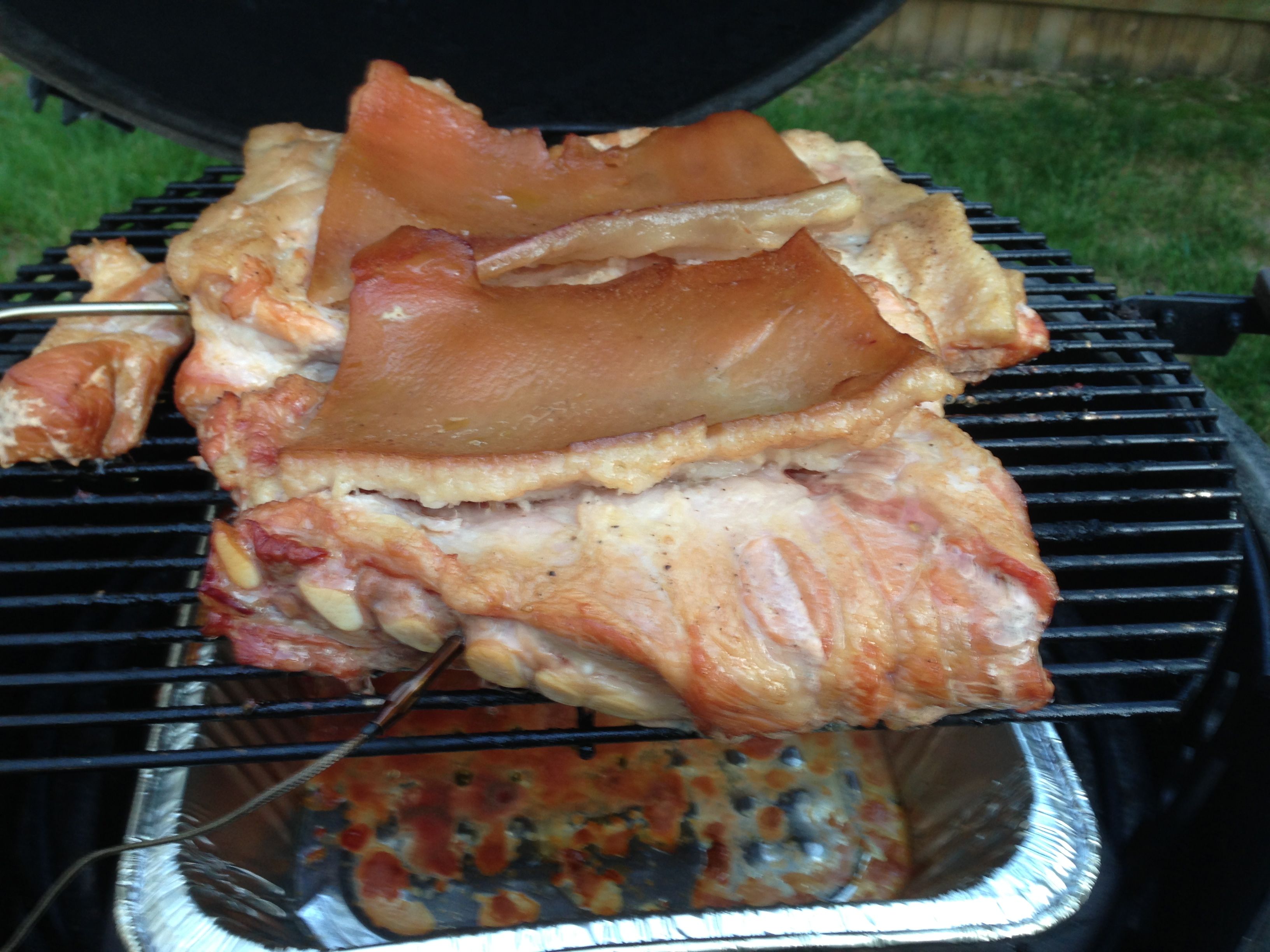 So he brought me a whole pork belly from the supermarket.  I am not a butcher, nor am I a charcuturie expert, but I can cook to IT and what the heck - smoke makes it all taste good!  This was the process - sliced the pork belly in half.  Cut the hide/skin off the top while preserving as much of the fat cap as possible.  cooked to internal temperature of 145 then pulled.  Refrigerated for 48 hours, sliced very thin and my neighbor cooked on his gasser grill (heresy!) until crispy.  It was fantastic.