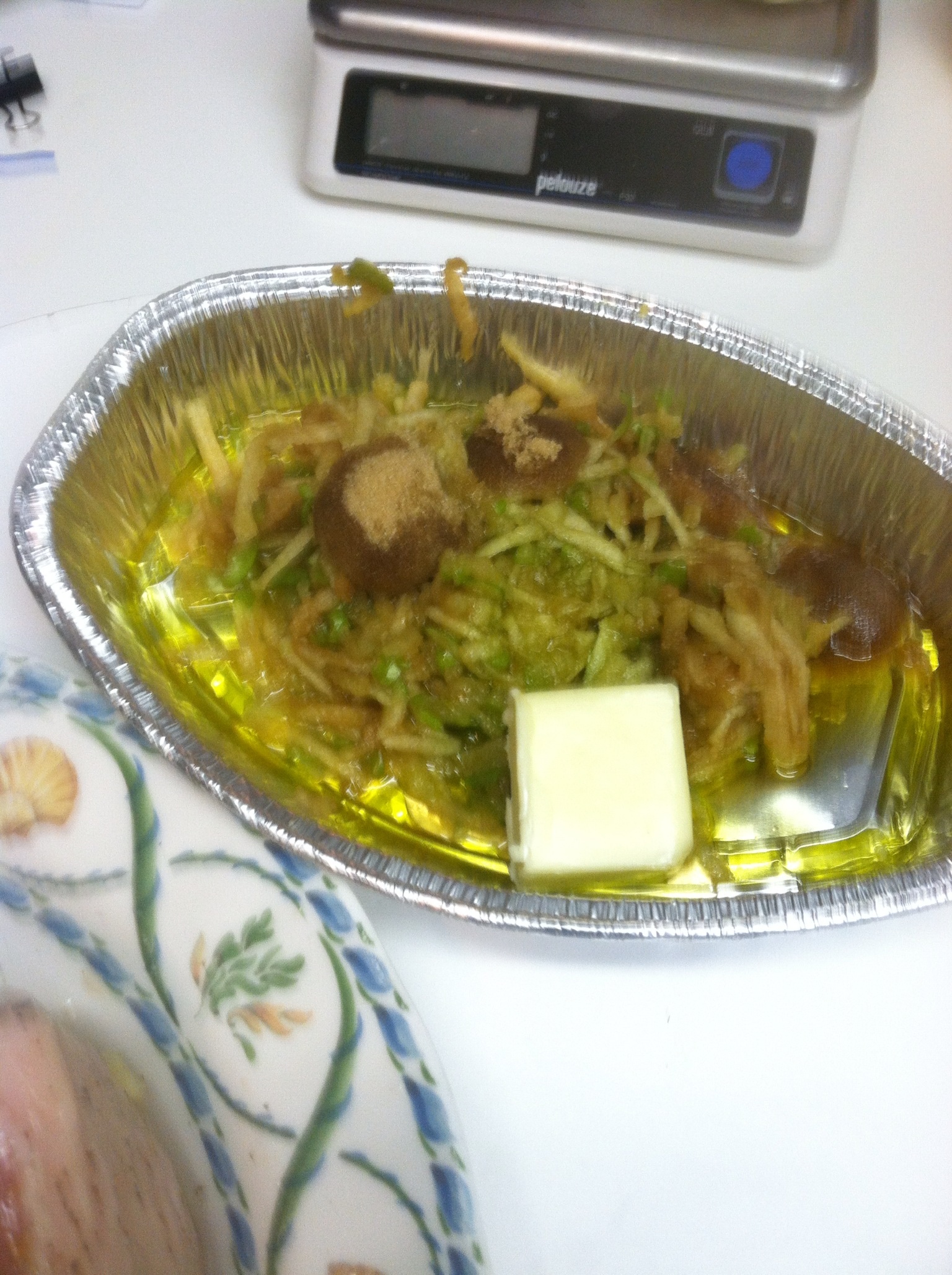 Compote has grated granny smith apple, butter, evoo, brown sugar & honey after chops sear then place in & out of apple / caramel hot tub as they cook adding some pig fat to the caramel apple goodness.