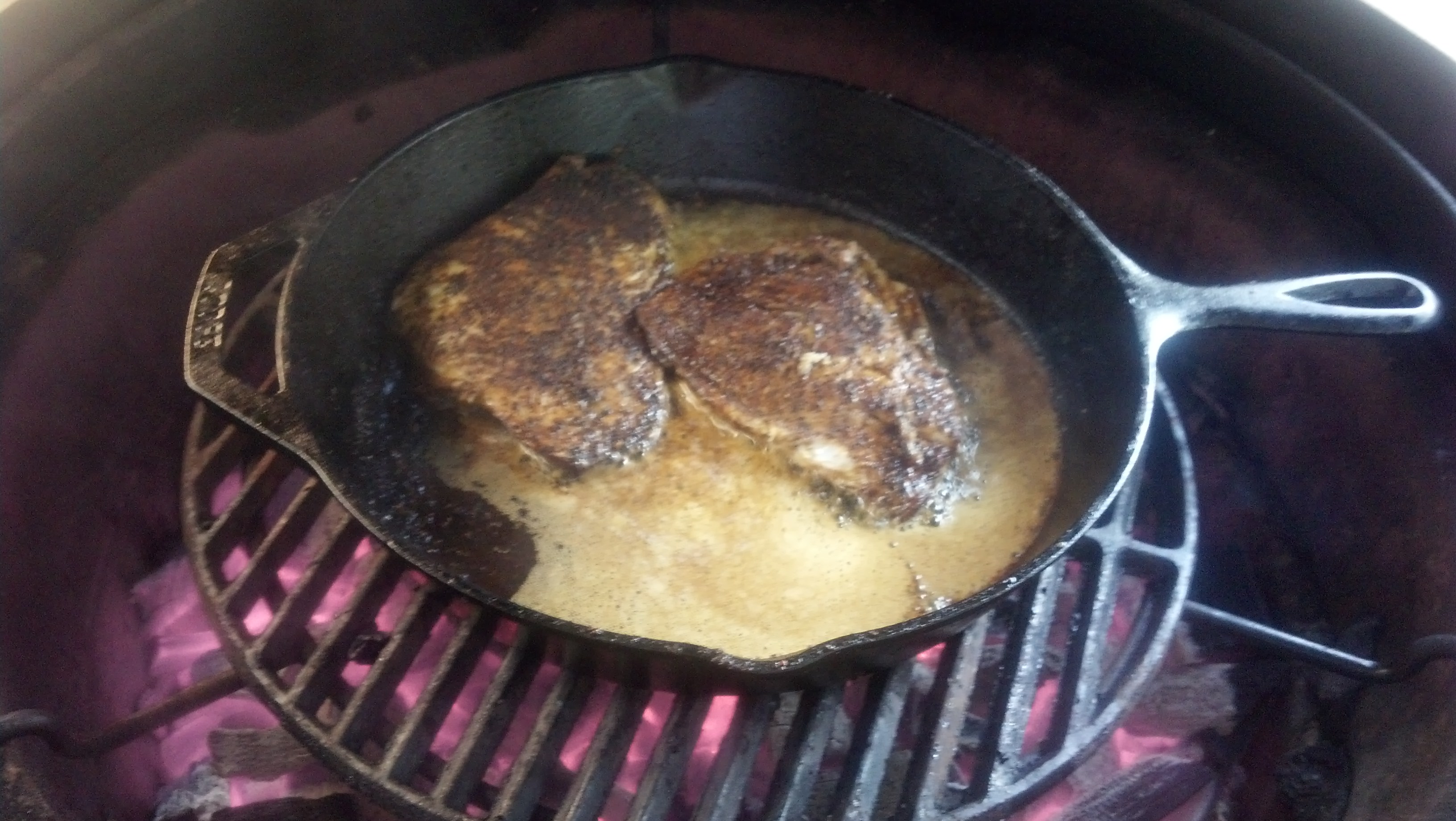 I love living on the Gulf and having an egg...We went Red Snapper fishing yesterday and limited out pretty quick. I blackened some filets tonight on my Lodge CI skillet using the woo2 to drop down on the coals at about 500 degrees. Blackened in peanut oil, butter and blackening spices(paprika, red pepper, garlic powder, black pepper etc.)..Served with stone ground grits and sauteed some spinach in the CI skillet. It was mighty tasty...