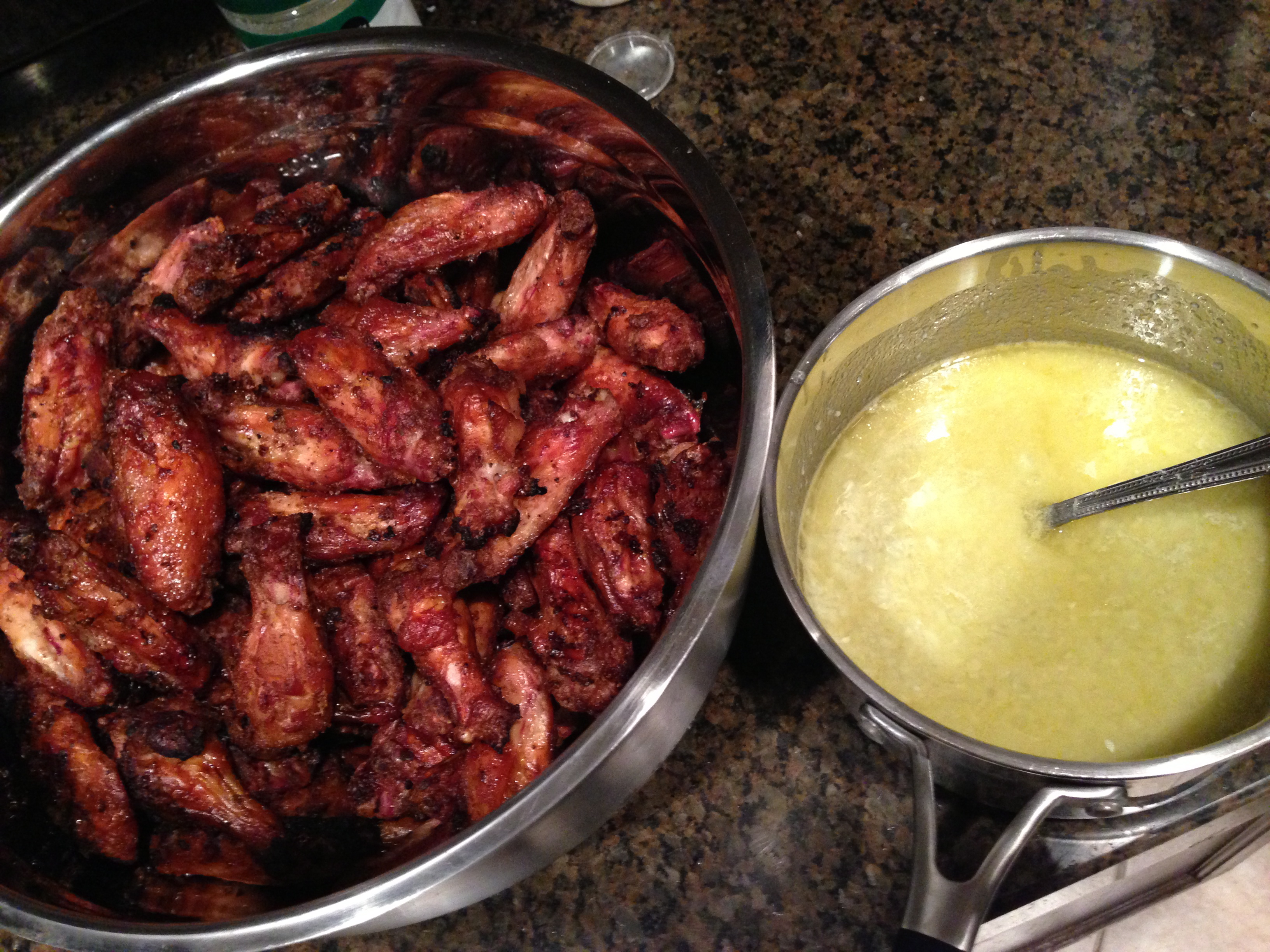 Remove cooked wings and place in large bowl. Toss using half the sauce to coat, put back on BGE for caramelization. After about 10 minutes, pull the wings off and re-toss in remaining sauce and serve with Bleu Cheese.