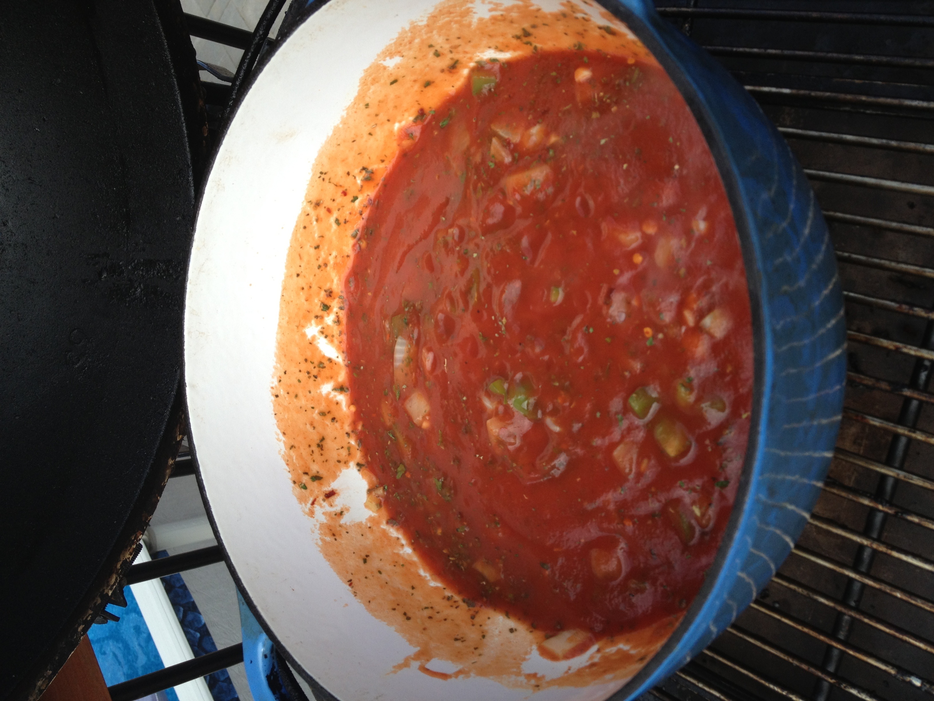 Added the indirect stone and put the Dutch oven on the egg and got the egg to 300. After 10 minutes I added a little olive oil and some chopped garlic. After 10 minutes added the cut up peppers/onions and cooked for 10 more minutes. Added a can and a half of tomato sauce and spices (basil, oregano, parsley, red pepper flakes). Added a bunch of fresh spinach. Added rhe meatballs and Letting sauce simmer for 1.5 hours uncovered.