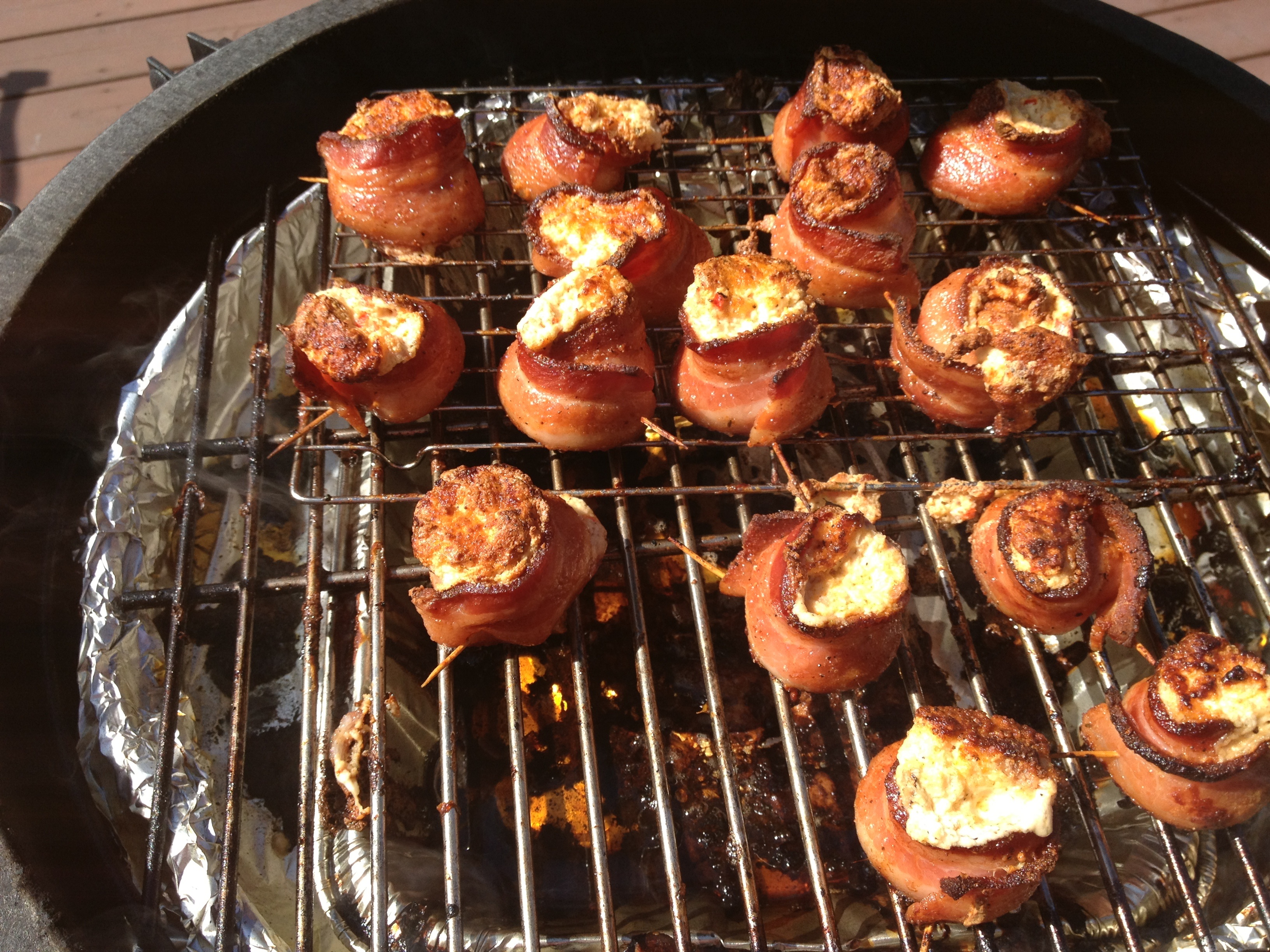 Forgot to take a pic before pulling if the heat. Here they are sauces and ready to go. SWMBO wrapped the complett around in bacon. Not just one strip. Appetizer for the Pig Shots.