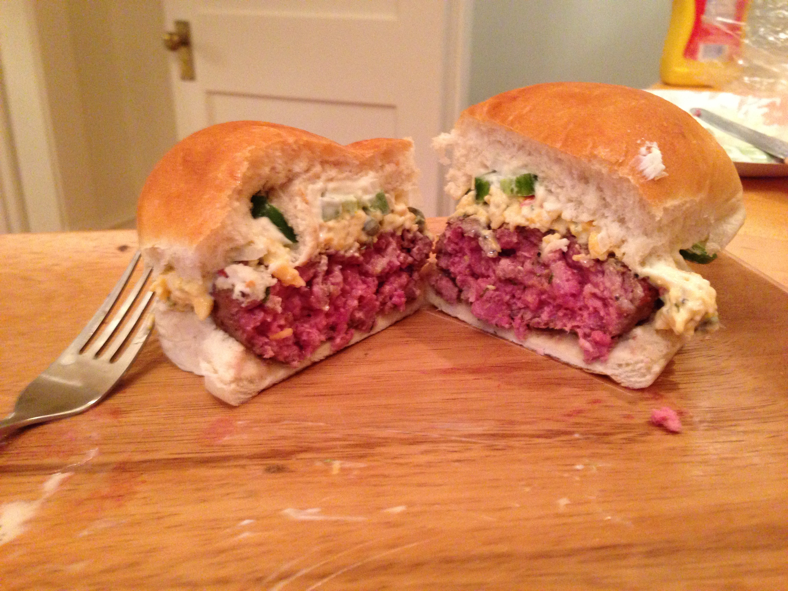 I was in Birmingham, AL this past weekend and went to the farmers market at pepper place on Saturday. I bought some fresh hamburger meat from Holmestead Farm, vegetables, and homemade pimento cheese from a vendor that slips my mind. I pattied the burgers tonight and noticed a considerable difference from store bought meat just by touch. At $6/lb it wasn't much more than regular meat. I seasoned with salt, pepper, and garlic. Cooked until medium on the medium egg. Put them on a sweet roll and topped with pimento cheese, fresh onions and jalapeños, and secret aardvark habanero. They turned out pretty awesome. The fresh and unique ingredients definitely helped. I will definitely cook them again!