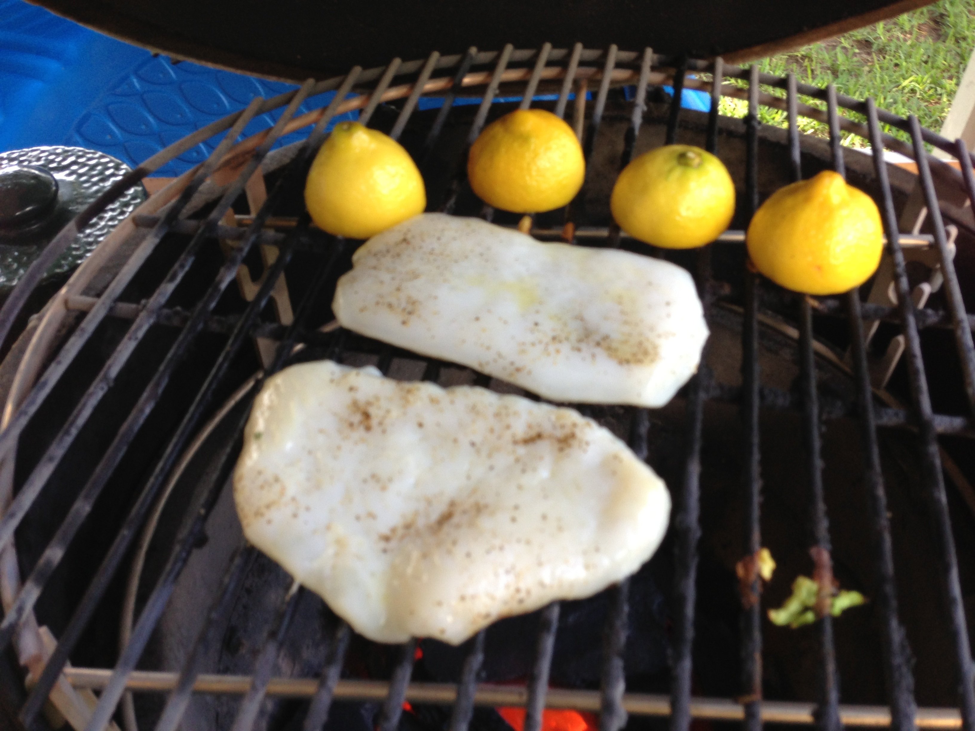 Got two calamari steaks from HEB, rubbed with EVOO, salt and pepper and cooked raised direct 450 grate for two minutes per side. Tender and tasty.