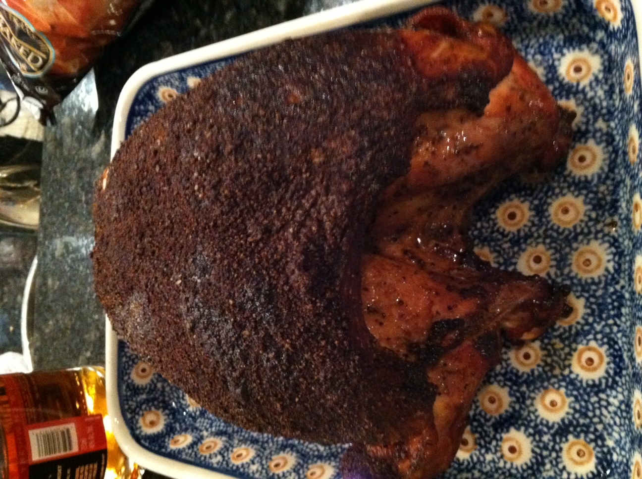Saw a lot of chatter about this preparation on thios forum so I thought I would give it a try.  Results were outstanding.  Brined and followed Mickeys coffee rub recipe from forum.  The wife prepared some bacon gravy, stuffing and standard mashed.  The combo was all just good not great.