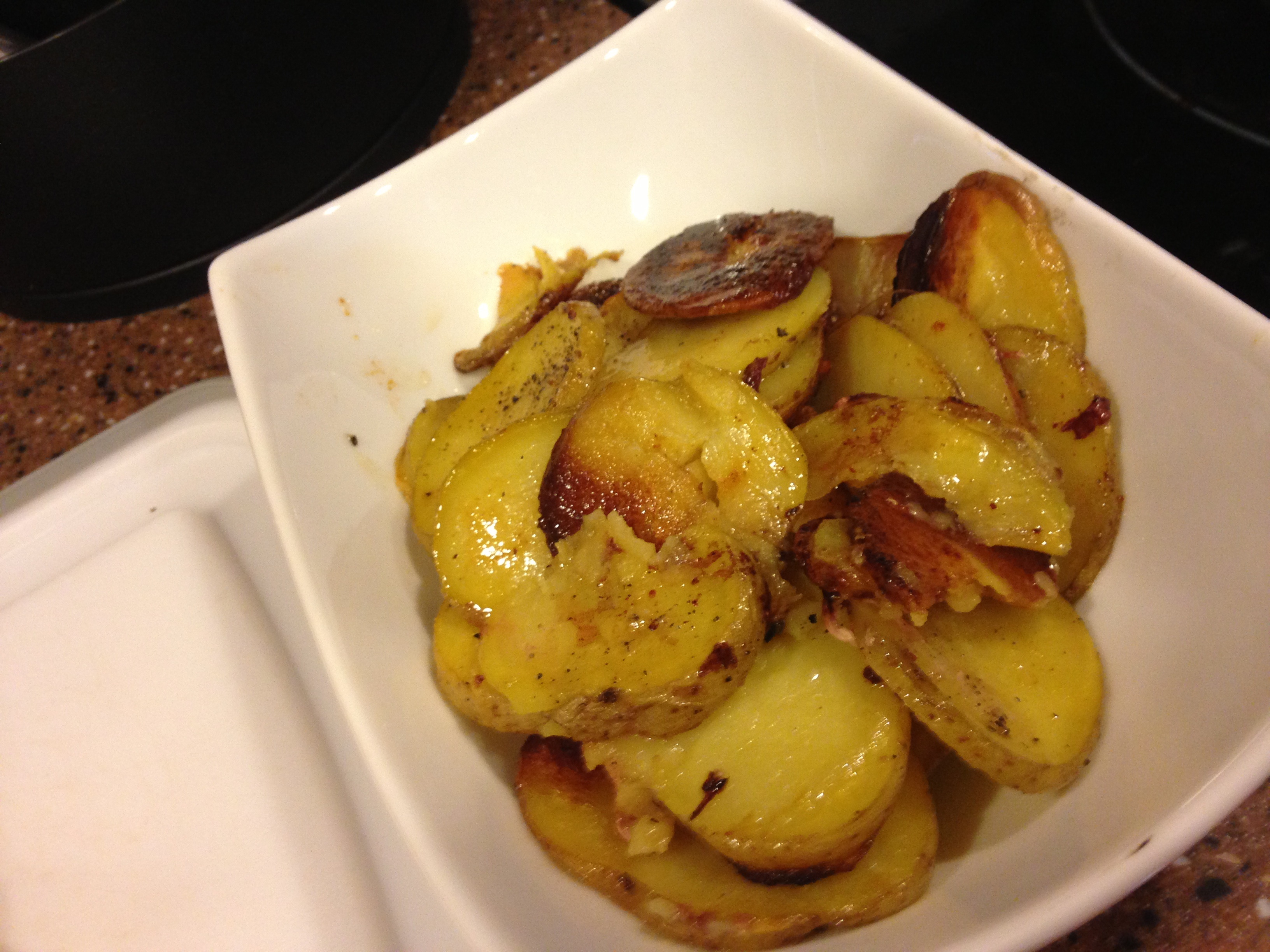 Here's what I will do different next time: some small spacers between the PS and the pan of potatoes. The bottom got pretty brown and crispy. I think I'll oil them first, and then toss them around rather than just drizzle oil. That might help the browning as well. Also. I'll use the mandolin to get even slices. I aimed for 1/8" slices but my knife skills are pretty weak.
