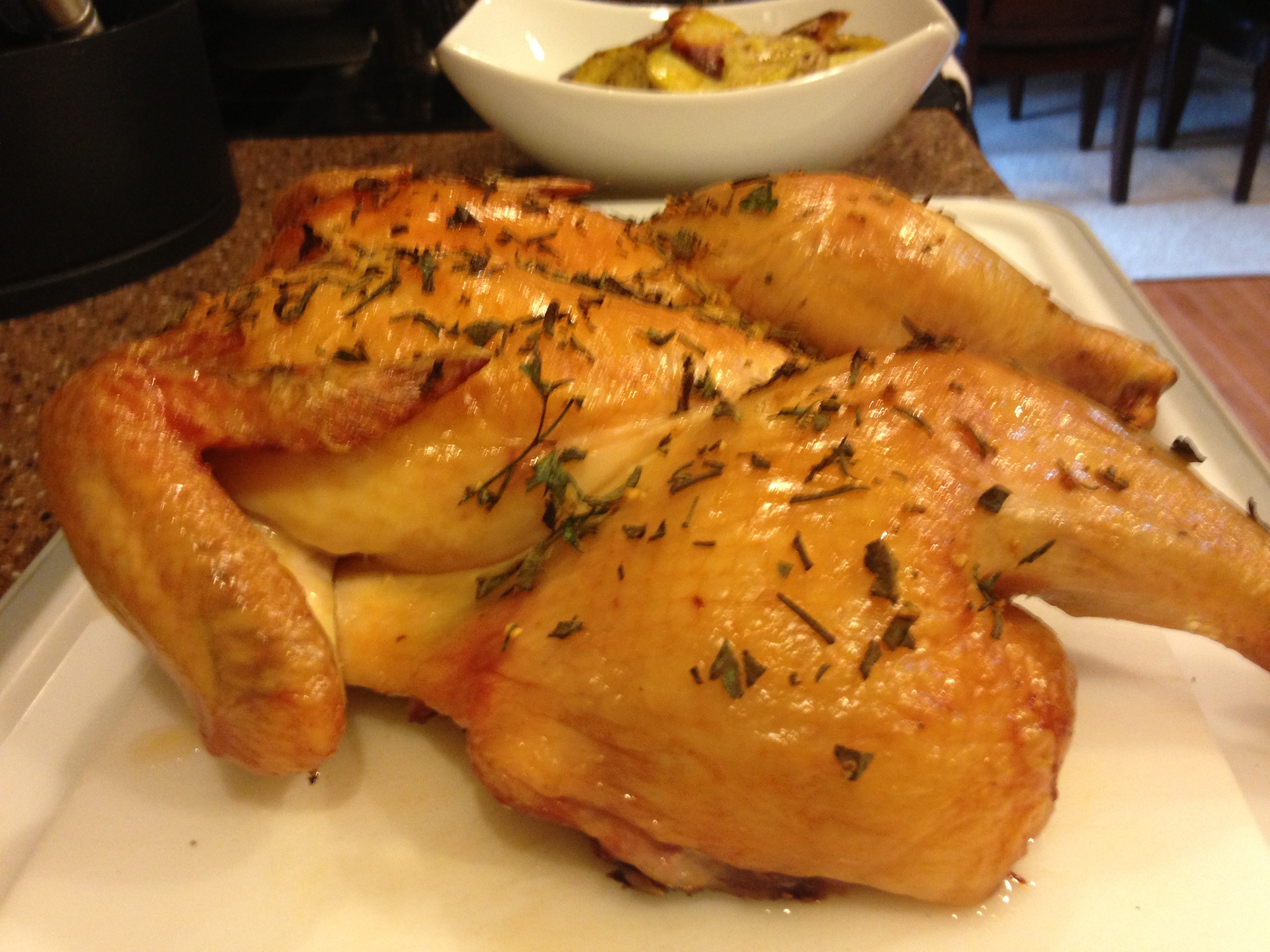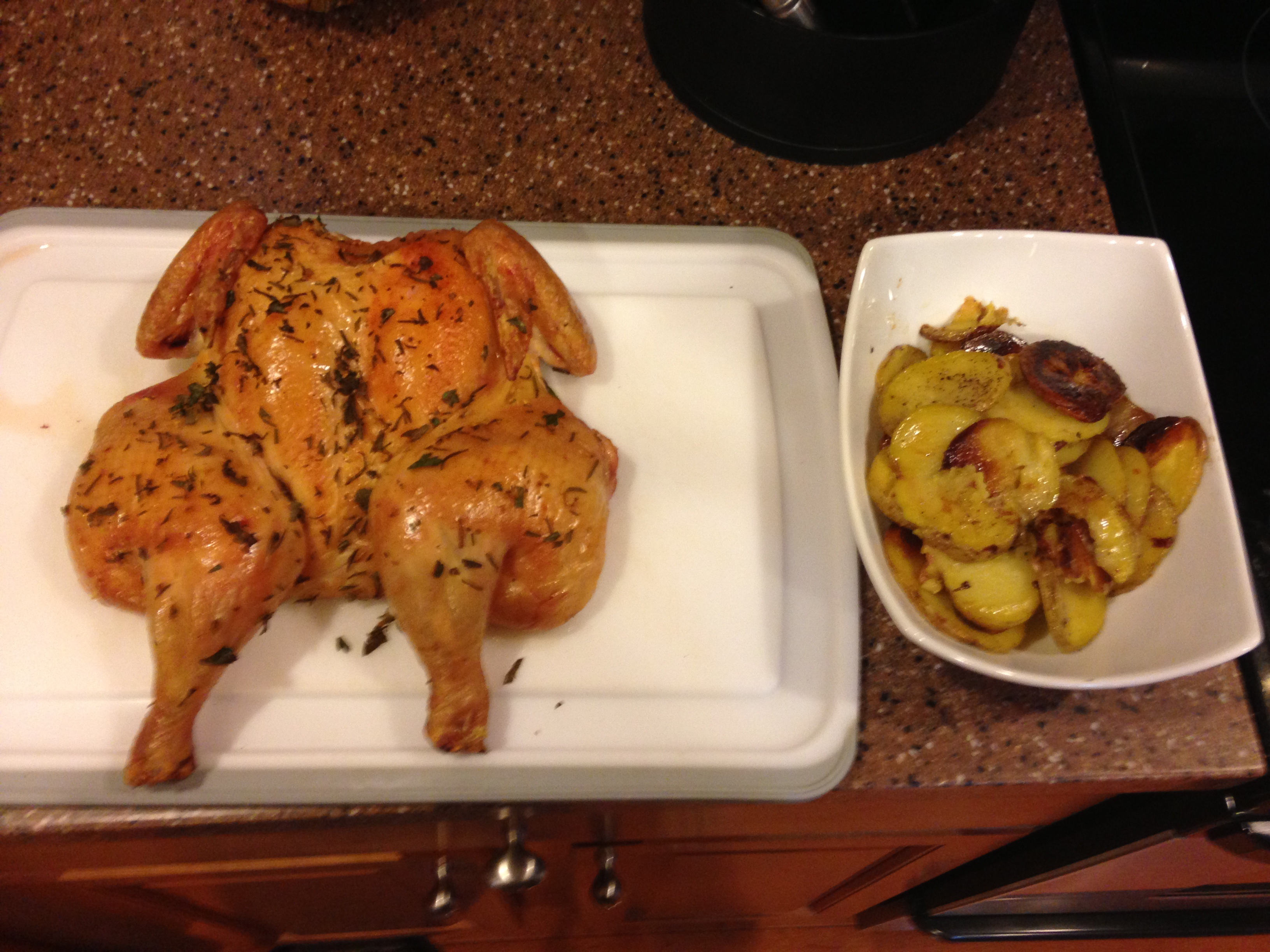 Spatchcocked chicken basted Yukon taters